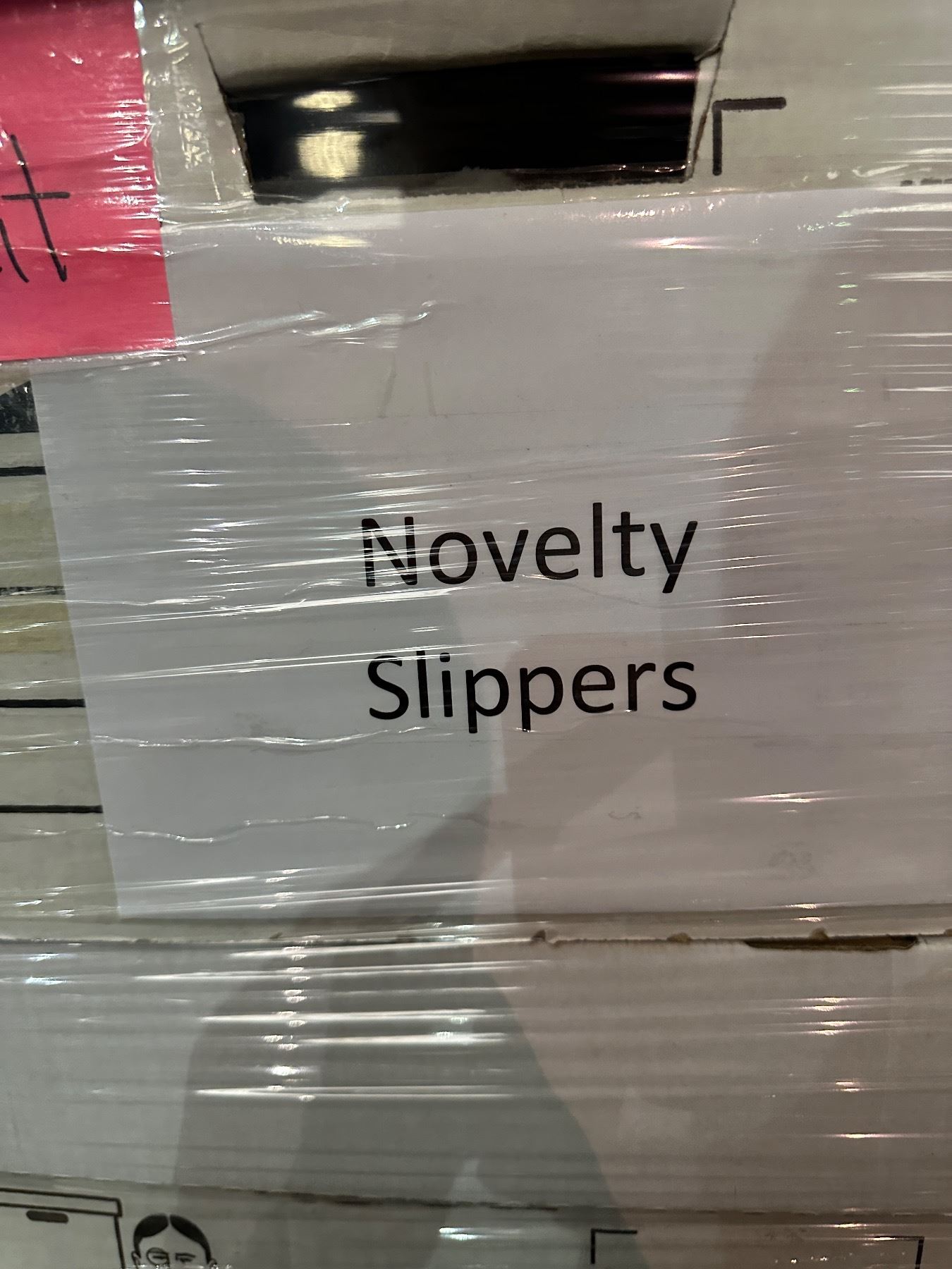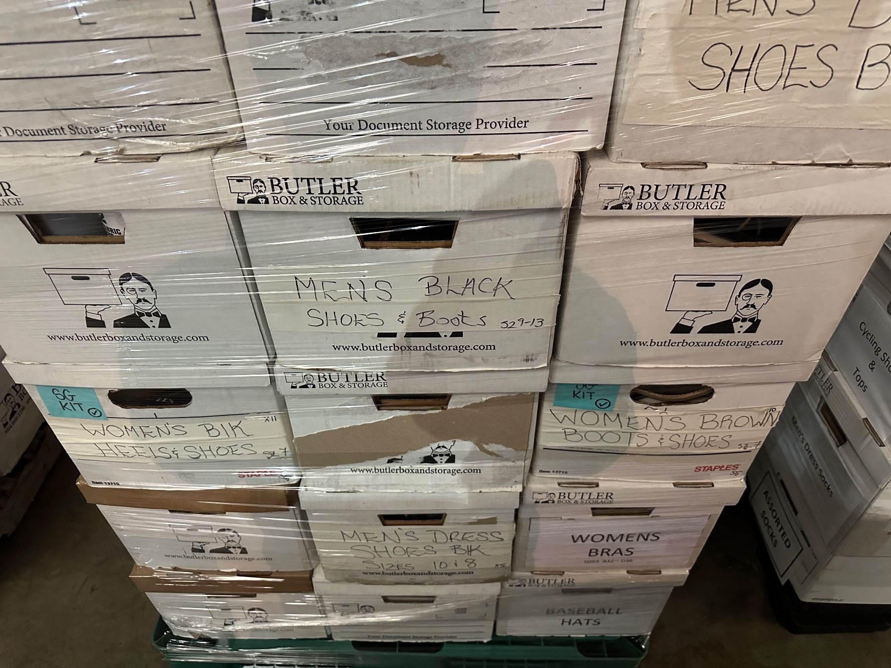 Pallet lot of misc. items including - men's black shoes & boots, women's heels & shoes, aprons, men's white tanks, hats, etc...