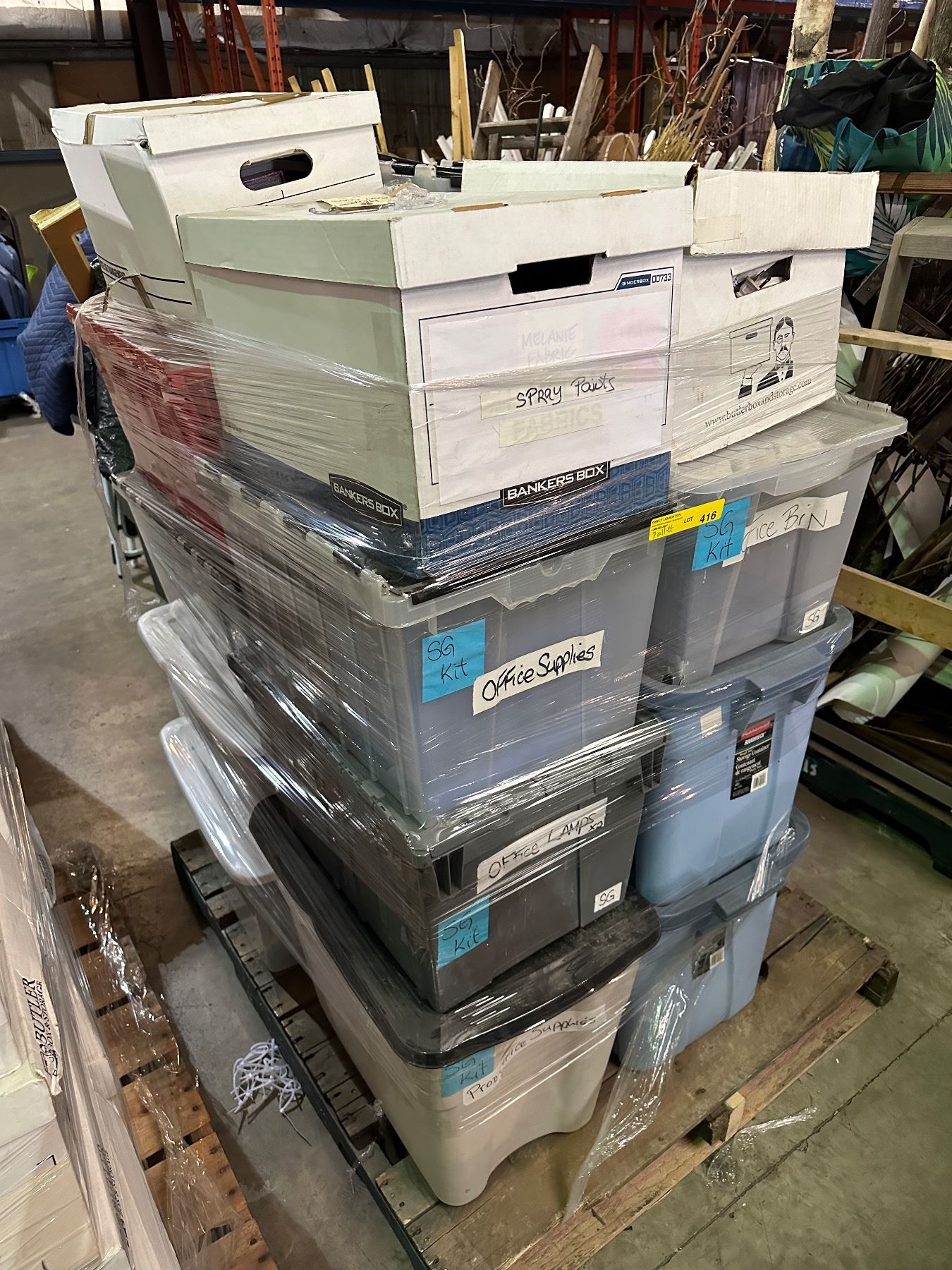 Pallet lot of misc. items including - office supplies, office lamps, spray paint, power strips, books, bins, etc...