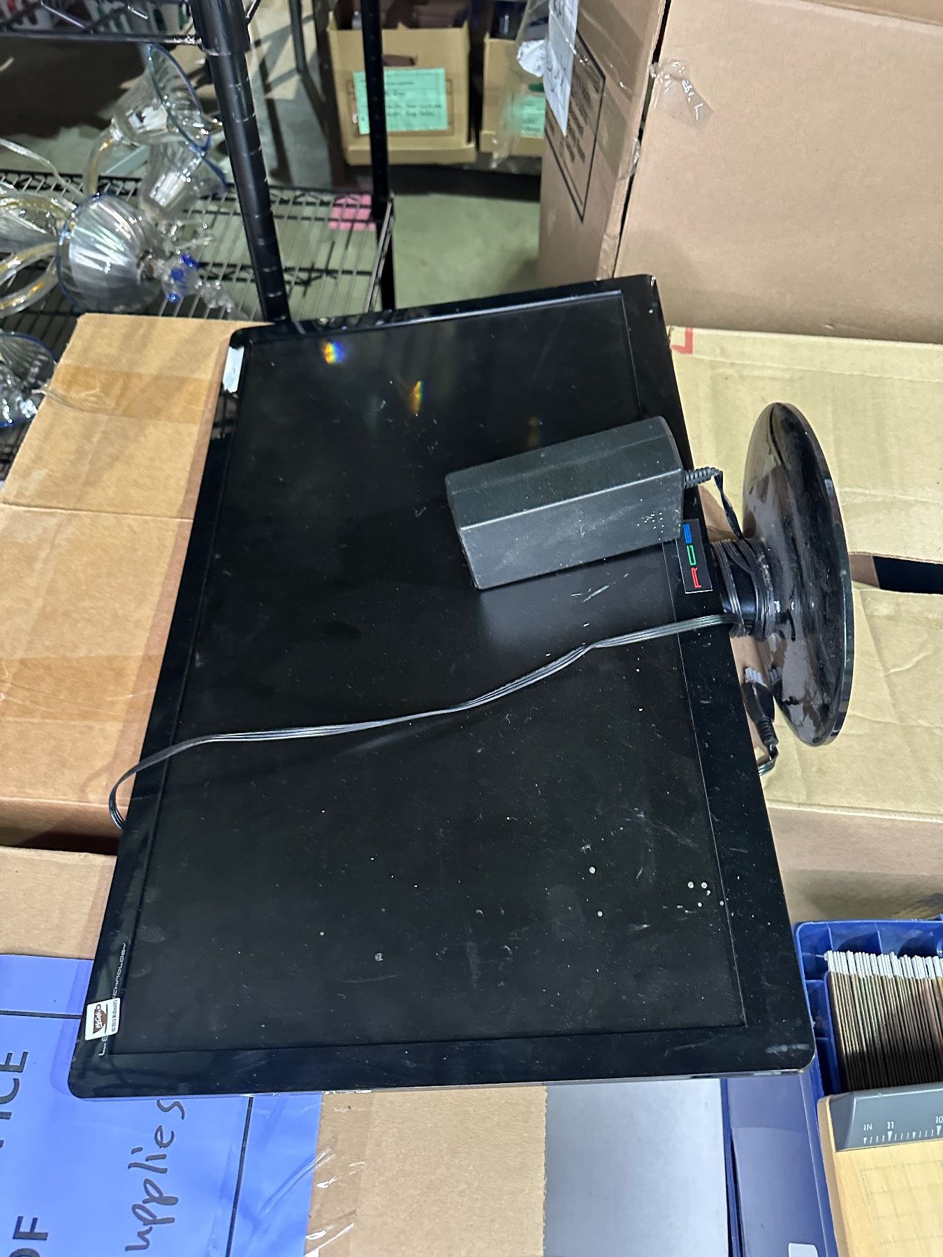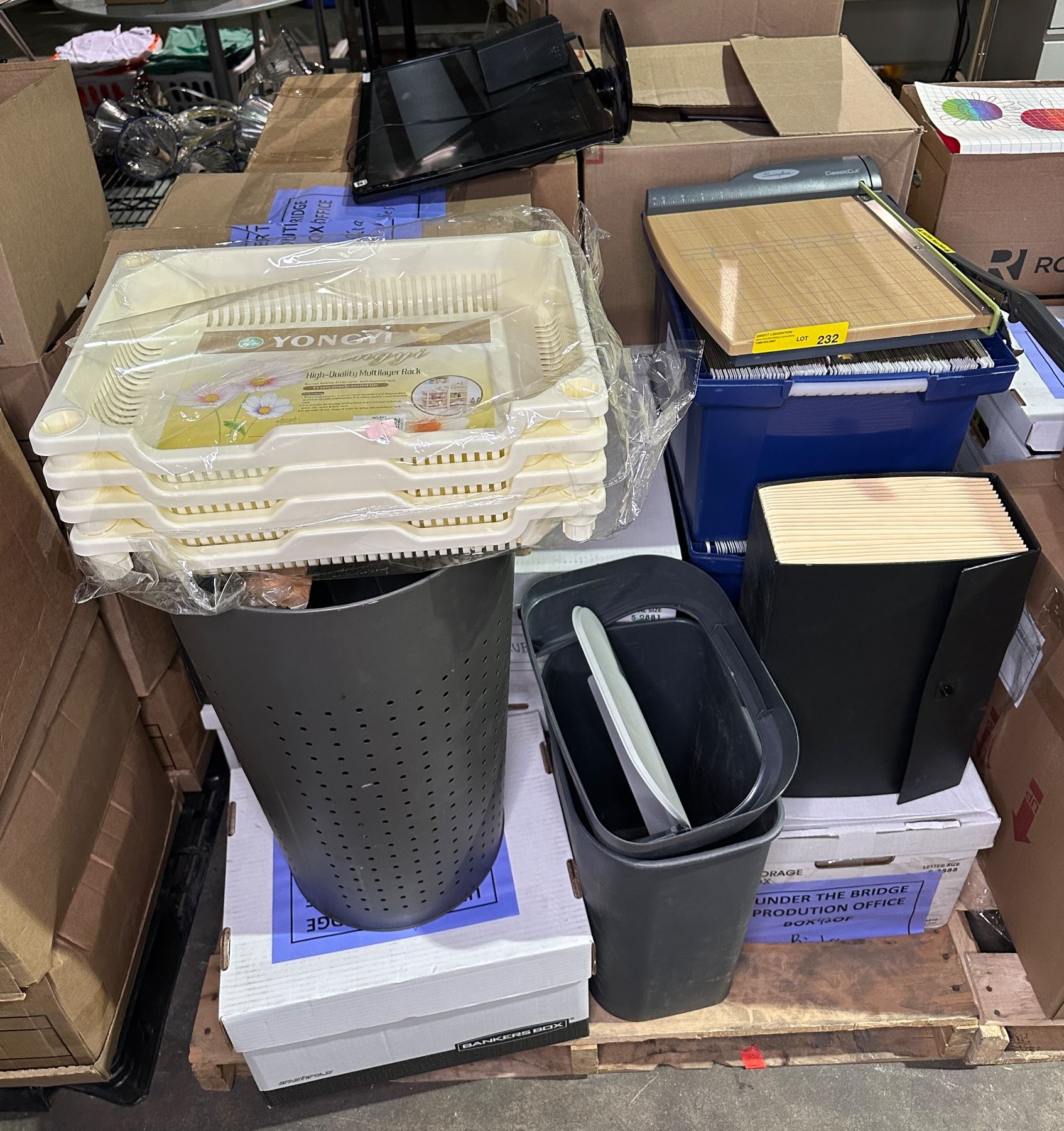 Pallet lot of misc items including - office supplies, paper cutter, bins, monitor, stand up rack, et