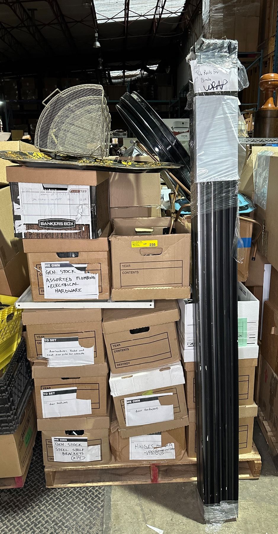 Pallet lot of misc items including - plumbing + electrical hardware, door hardware, steel shelf brackets, side rails for blinds, tray, etc...