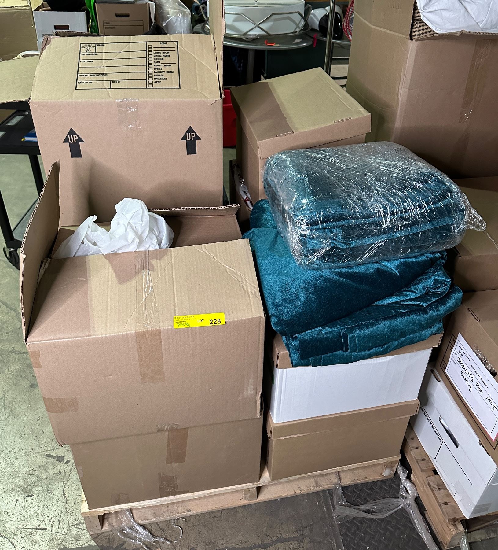 Pallet lot of misc items including - various sheets, drop cloths for dust, curtains, etc...