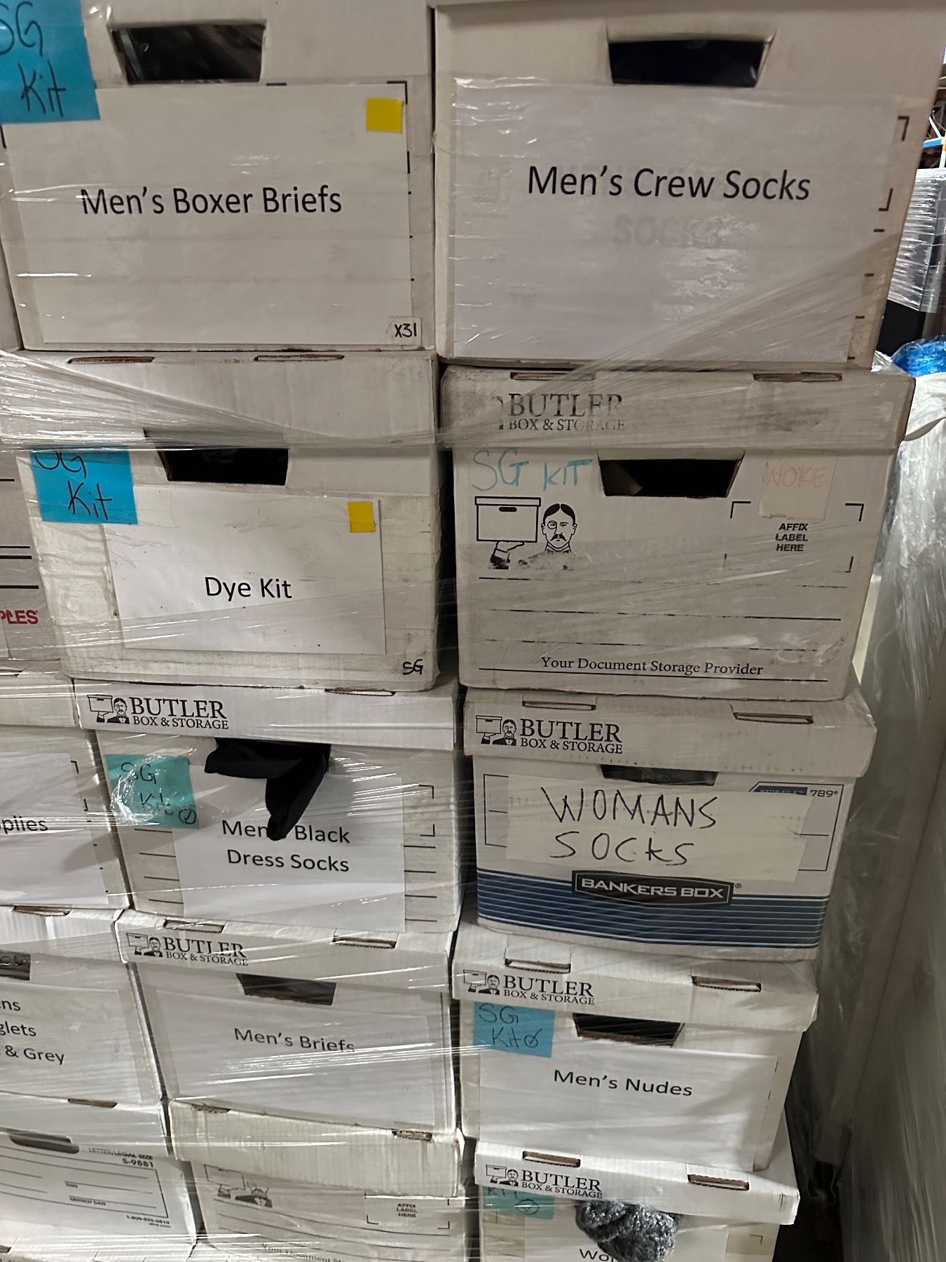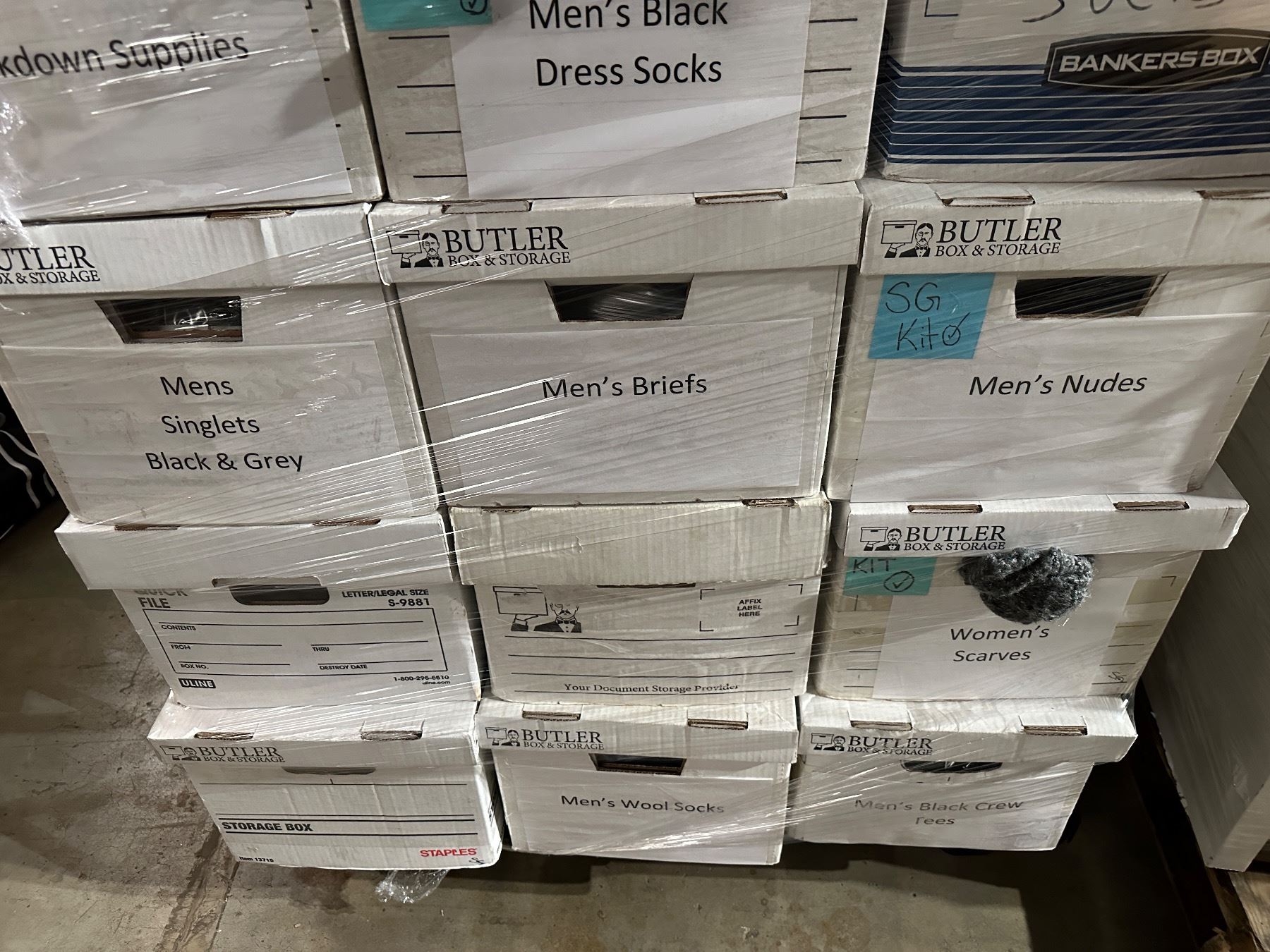Pallet lot of misc. items including - women's hats, men's black dress socks, women's socks, women's scarves, breakdown supplies, men's boxers,