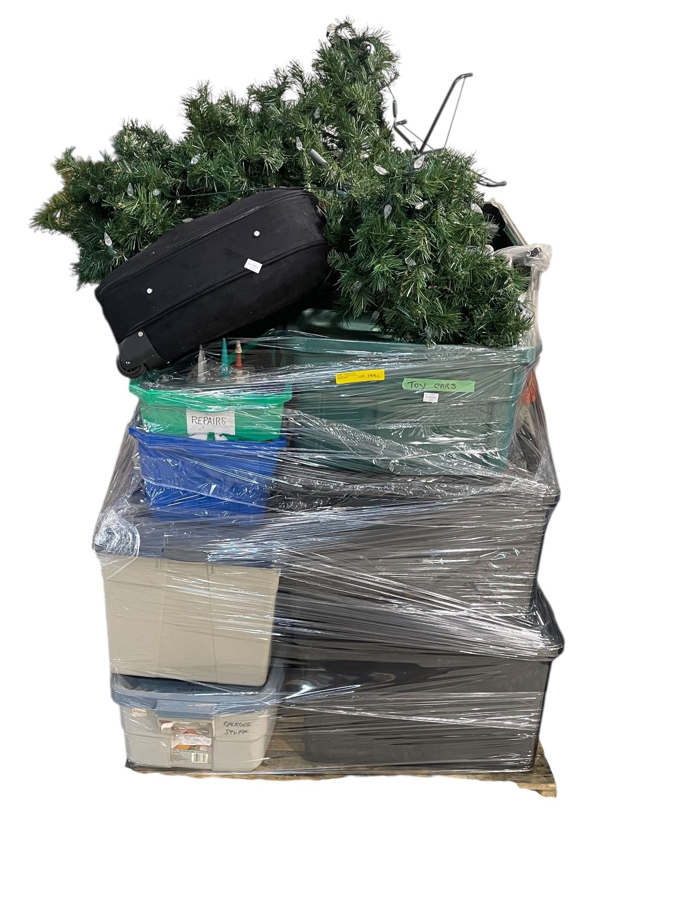 Pallet of Estate Items – Includes artificial Christmas trees, totes, luggage, household items etc