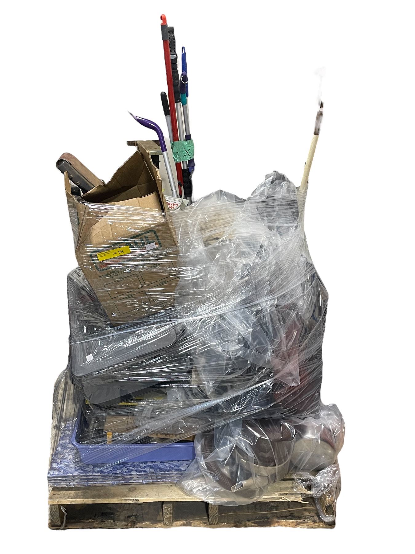 Pallet of Estate Items – Includes crutches, cleaning supplies, vacuum parts, mop buckets, step stool etc