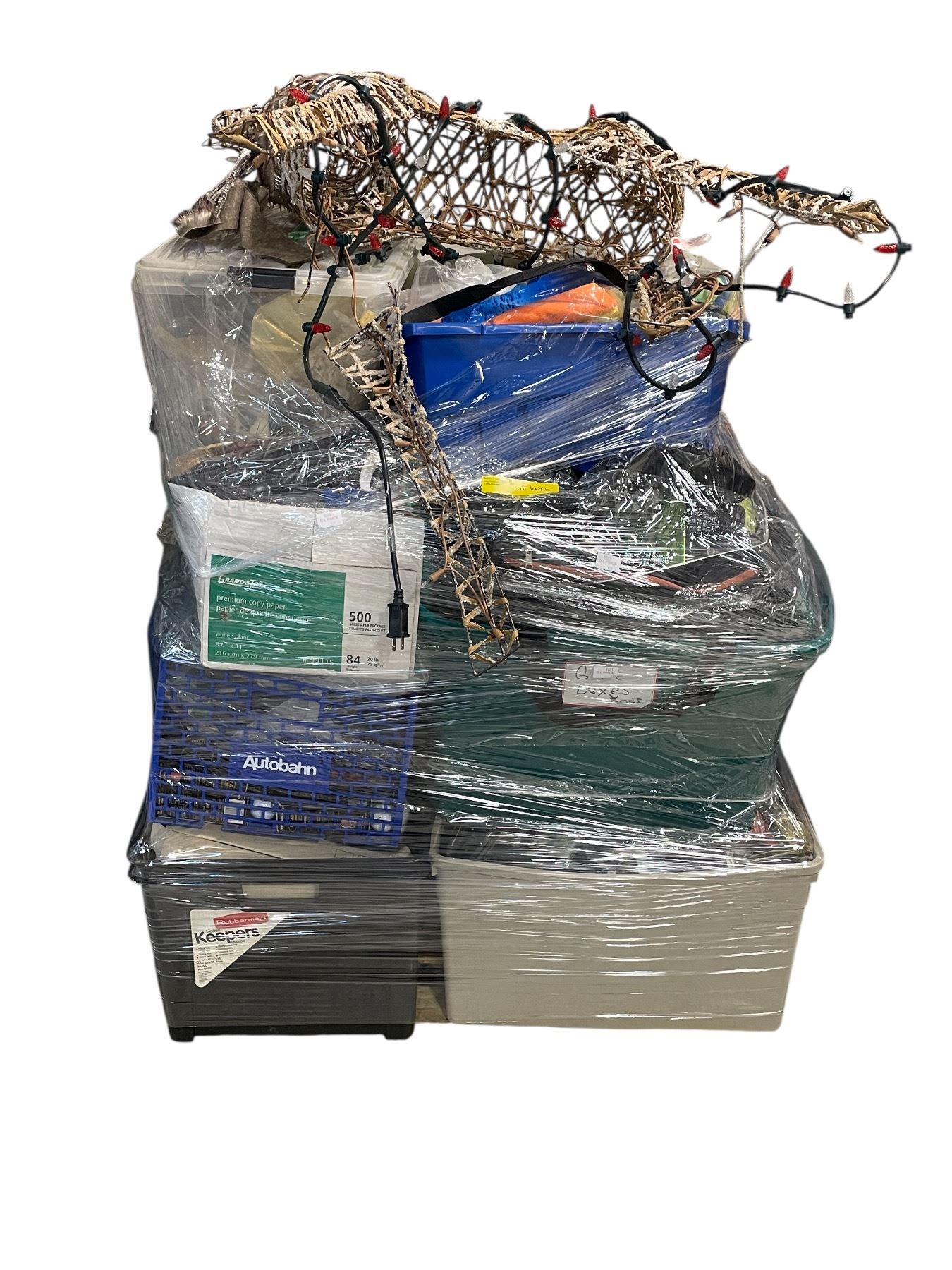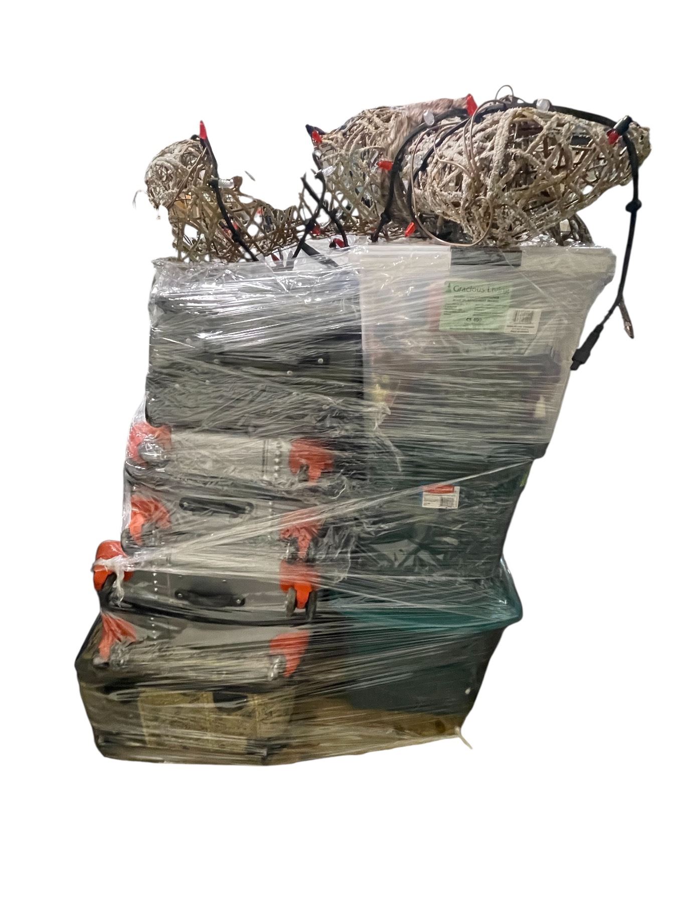 Pallet of Estate Items – Includes deer Christmas décor, storage totes, luggage, lights etc