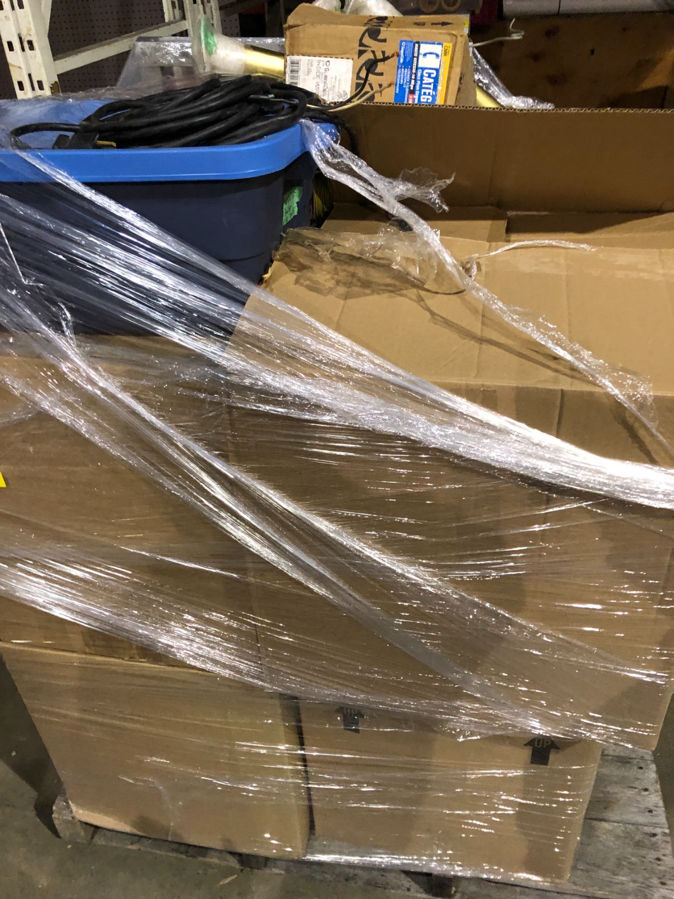 Pallet of Light Fixtures, electrical cords, light bulbs, electrical cable, rolls of electrical wire, tables legs and more. From Set Décor Rentals.