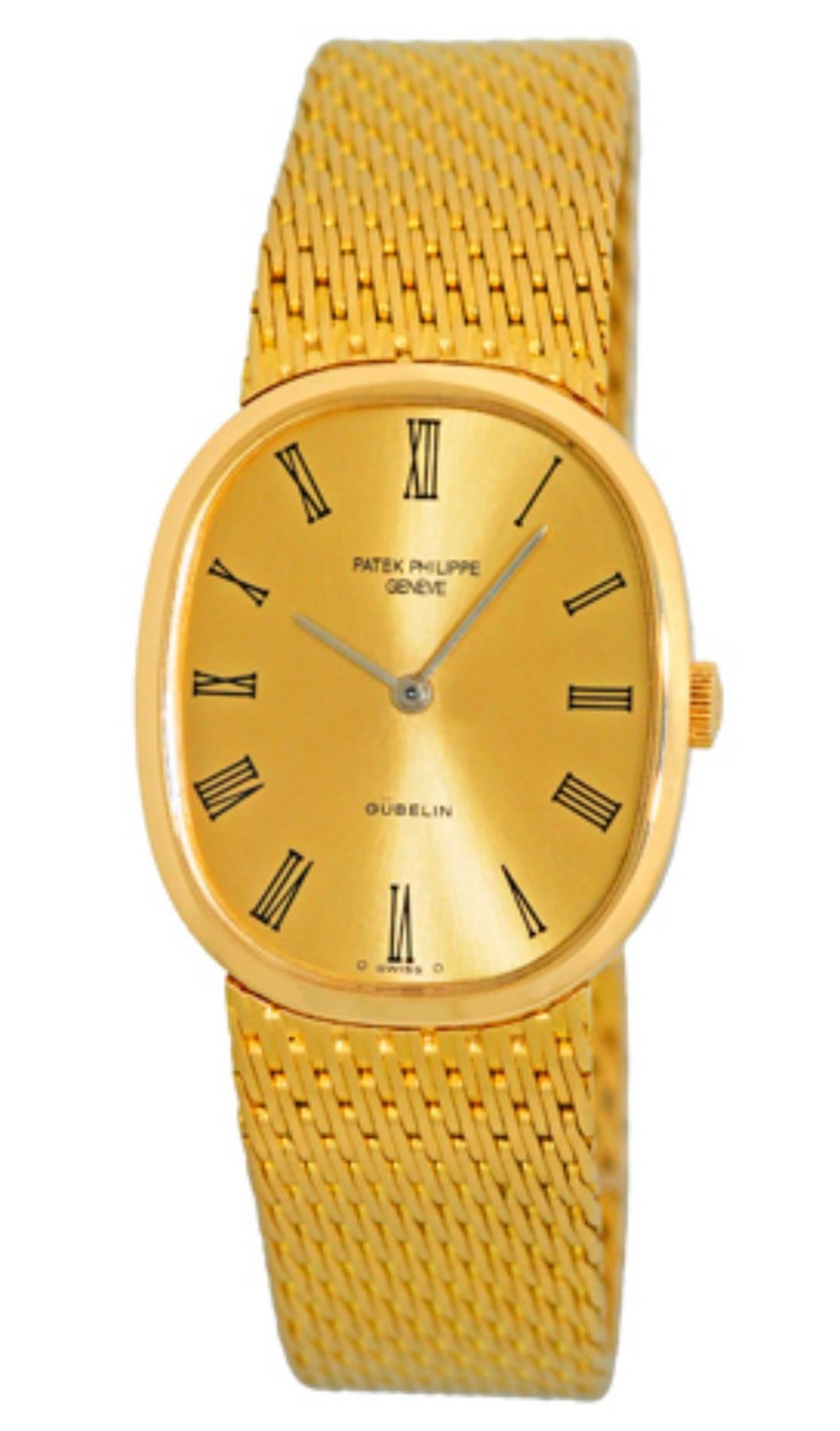18K Yellow Gold Patek Philippe Gübelin "Golden Ellipse" Dresswatch.Champagne Dial, Yellow Gold Hands and Black Roman Numerals, Sapphire Crystal.Matching Factory Original 18K Yellow Gold Patek Philippe Mesh Bracelet. (Total Bracelet Length: 7").Reference No: 3846Case Diameter: 26.5mm X 32mmHandmade Swiss Mechanical Movement (Calibre PP215).Like New, Perfect Mint ConditionEduard Josef Gübelin was recognized as perhaps the most important and influential gemologist of the 20th century.He not only helped establish gemmology as a science, and gave the industry one of its most important weapons against imitations and counterfeits.He also united science and art in ways that few have done before or since, inspiring many others to follow his lead.Please note: We will only accept Bank wire if you are bidding on this watch, credit card payments will not be accepted for this watch only)