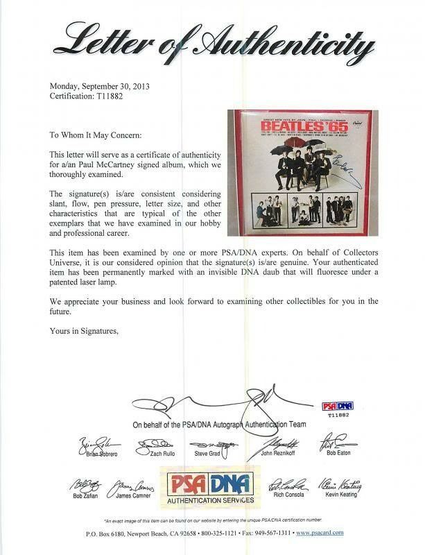 This PAUL MCCARTNEY SIGNED AUTHENTIC FRAMED BEATLES '65 ALBUM DISPLAY PSA/DNA #T11882 has been certified authentic. The display comes with the signed album and an 11x14 photo of Paul. The display measures 19x33.5. It will include the PSA/DNA numbered hologram and matching Certificate of Authenticity.