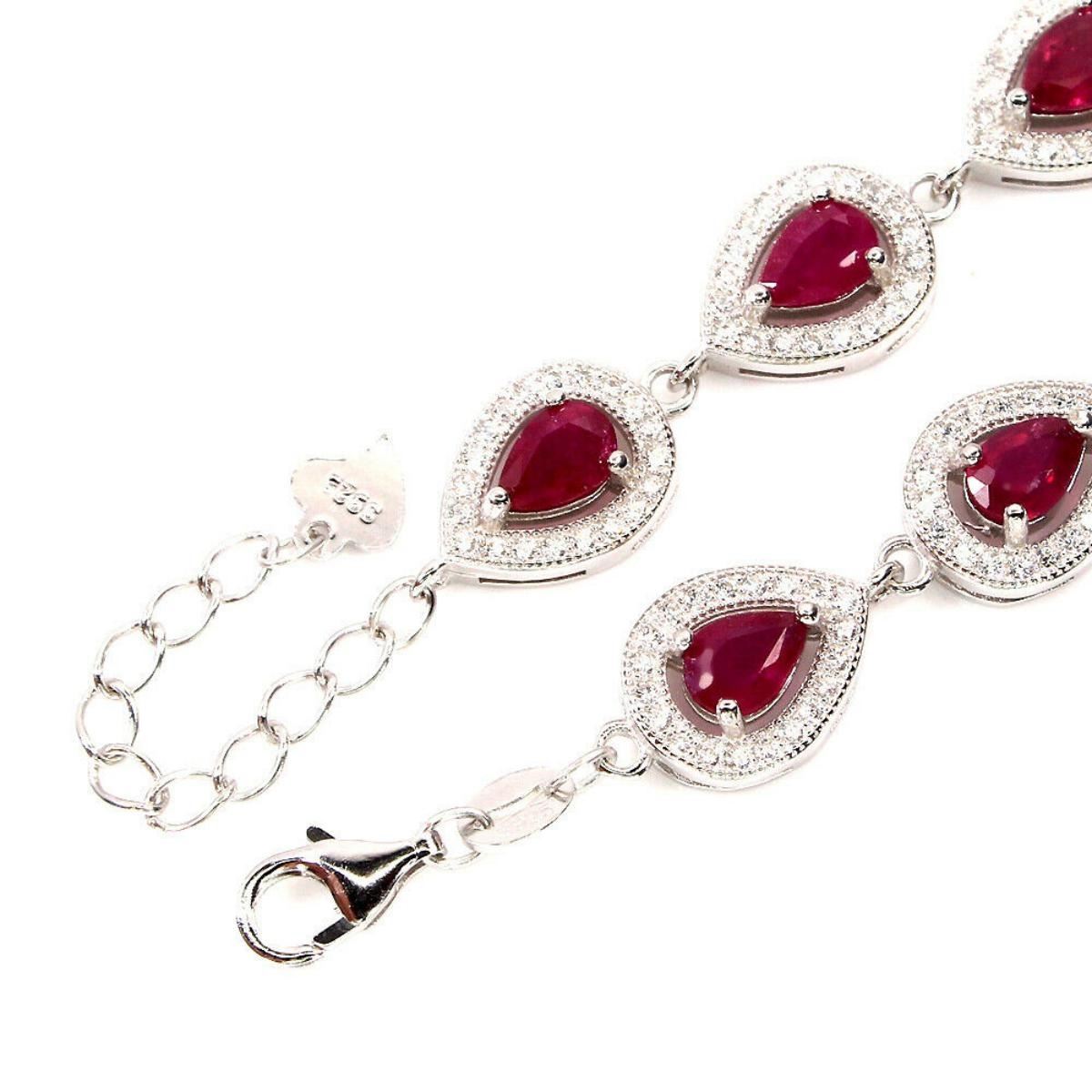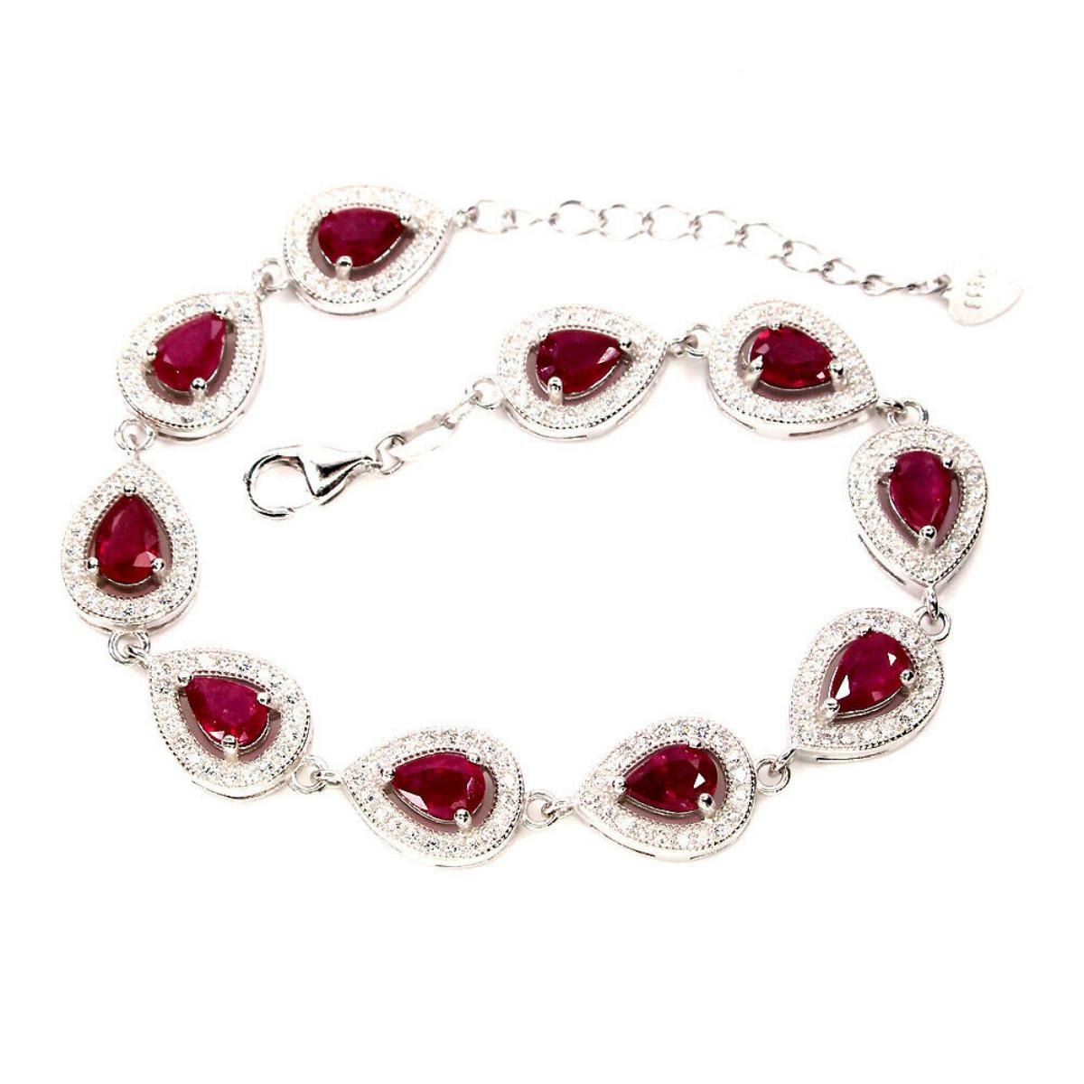 925 STERLING SILVER;PLATE-14K WHITE GOLD;LENGTH -(INCHES)8;MAIN STONE-RUBY;OTHER GEMS-CUBIC ZIRCONIA;TOTAL WEIGHT-57.36 CT (TOTAL WEIGHT OF SILVER + STONE)DIMENSION* STONE 6.0 X 4.0 MM. * CZ 1.0 MM. * FACE BRACELET 155.0 X 9.0 MM.;MAIN STONE SHAPE-PEAR CUT;MAIN STONE COLOR-TOP BLOOD RED;CLARITY/GRADE-TRANSPARENT;LUSTER-RAVISHING;TREATMENT- Yes;ORIGIN-MADAGASCAR;HARDNESS-9;