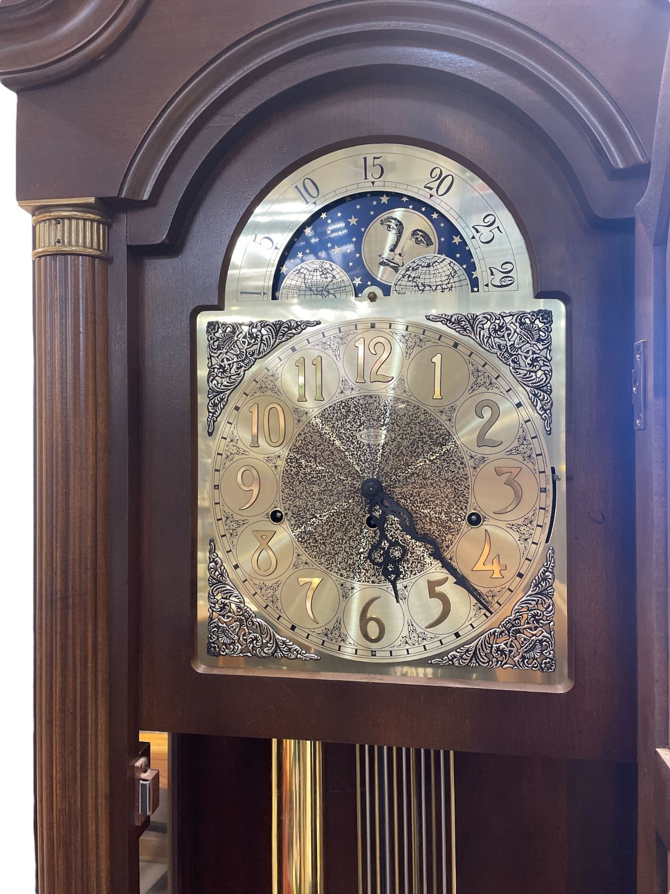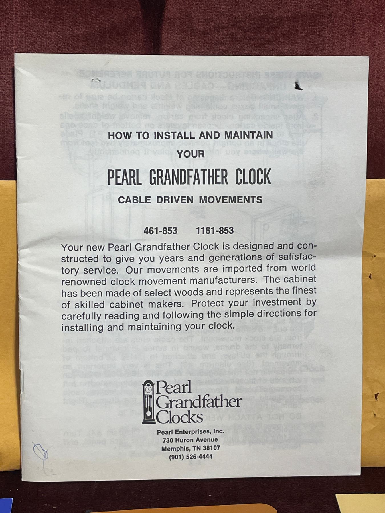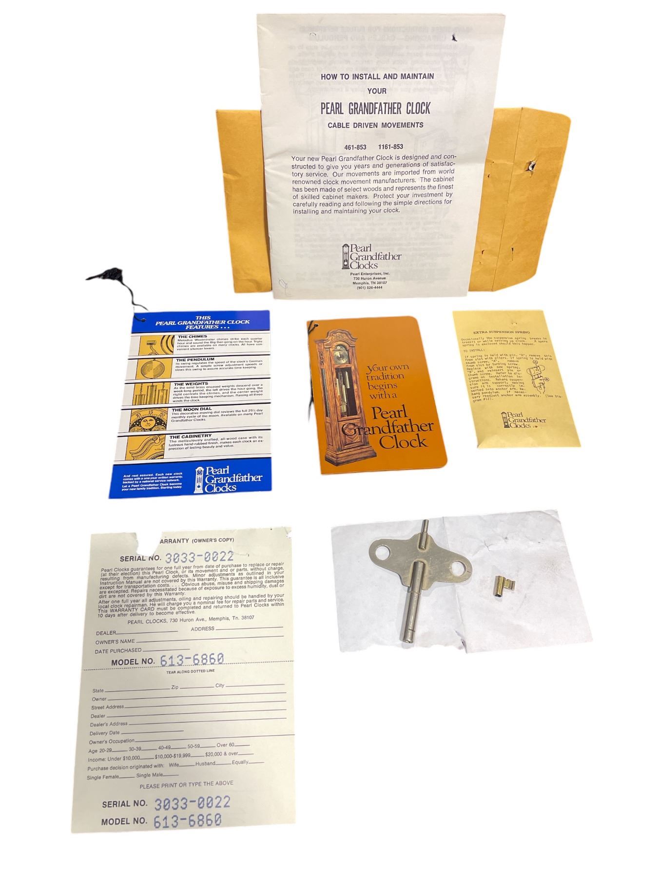 Pearl Grandfather Clock w/ paperwork & keys - approx 19 1/2in W x 12in L x 7ft tall