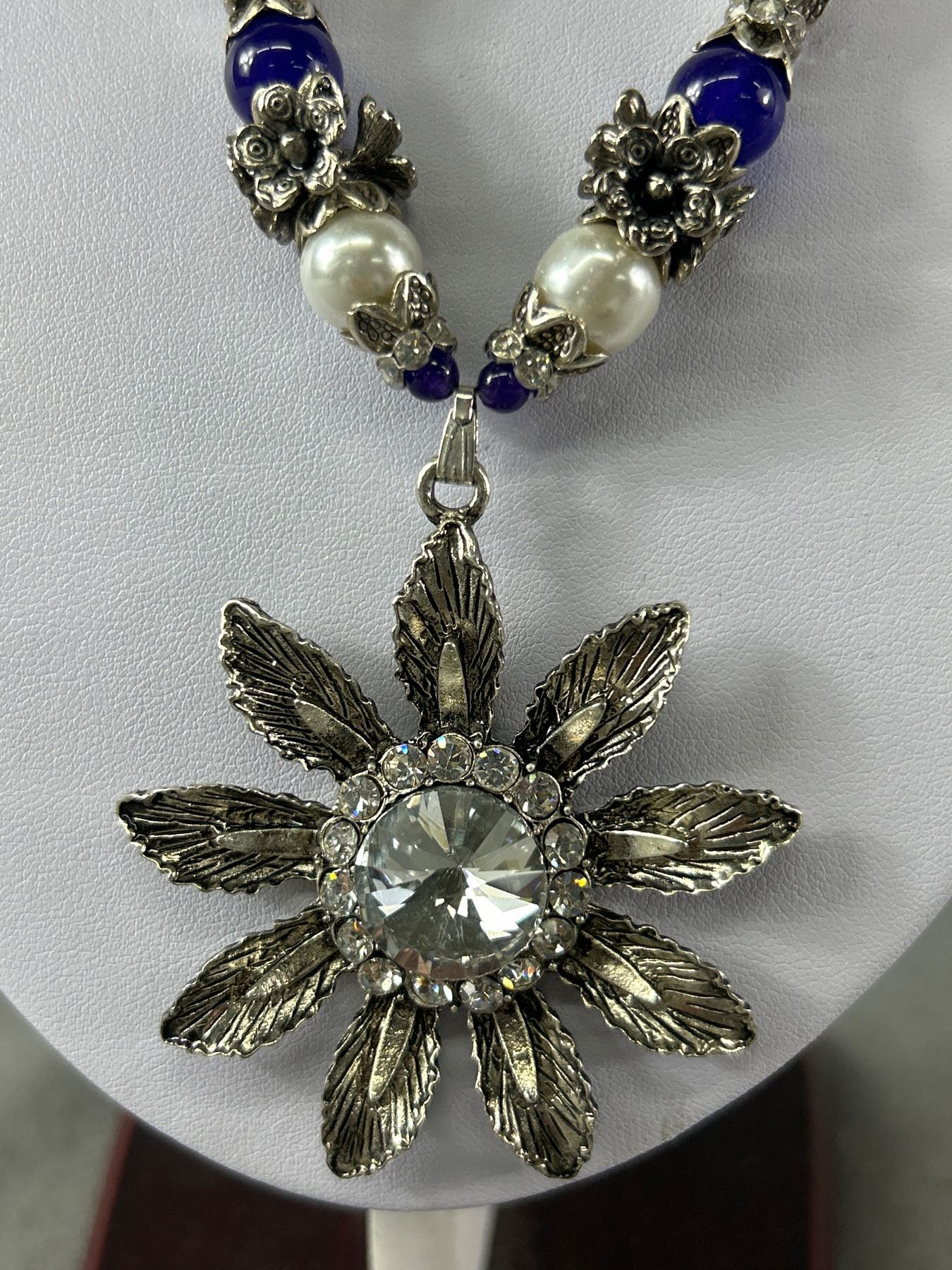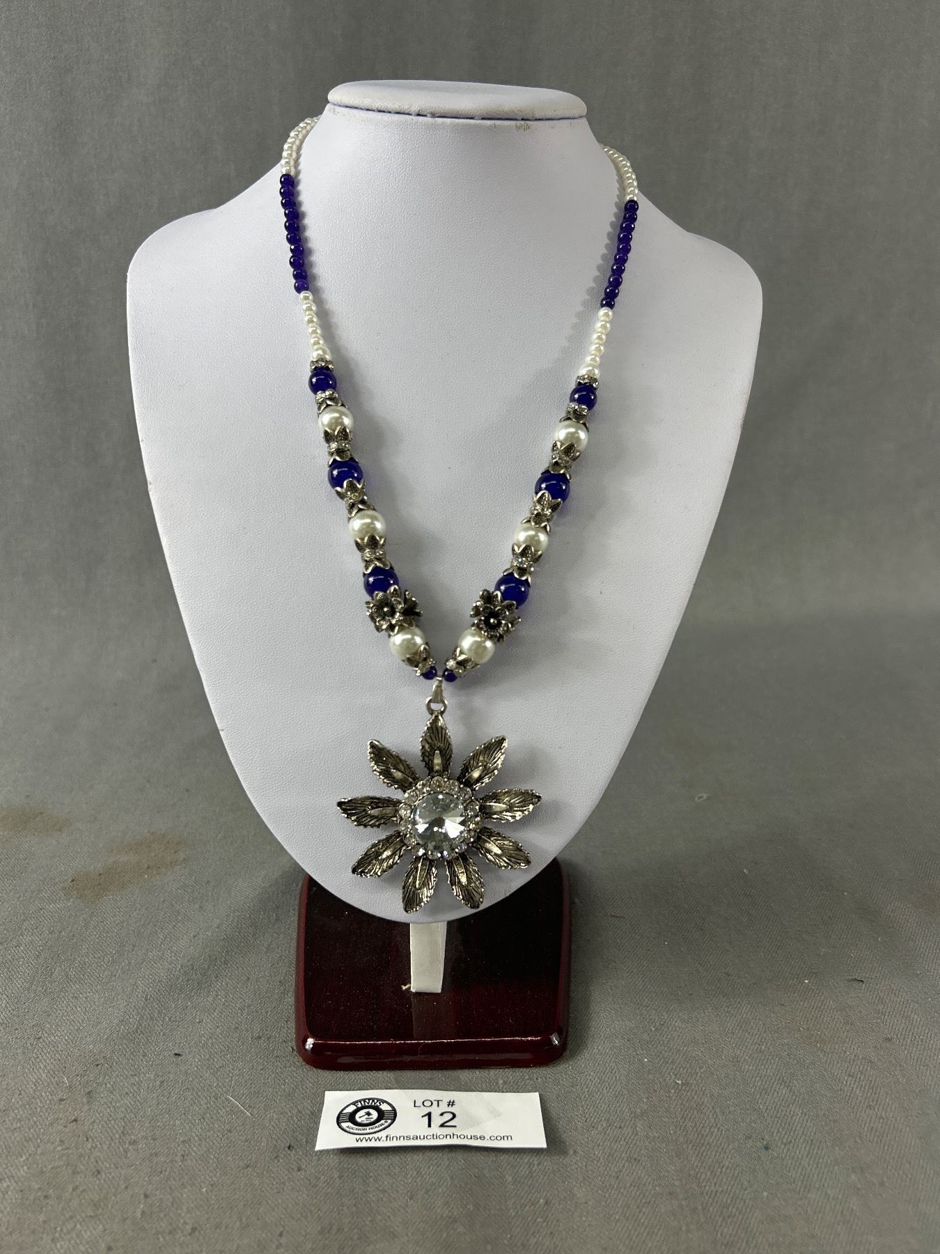 Pearl, Lapis Bead Rhinestone 20" Necklace w/ 2.5" Flower Pendant.