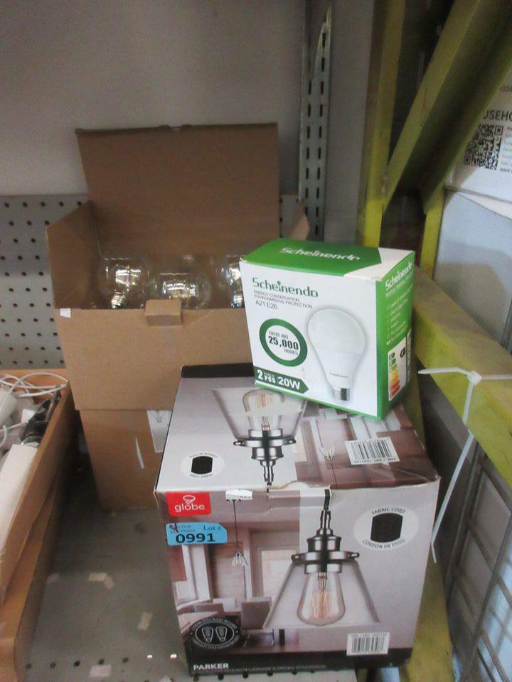 Pendant Light, 2 Boxes of G25 Bulbs & a 3 Way Bulb