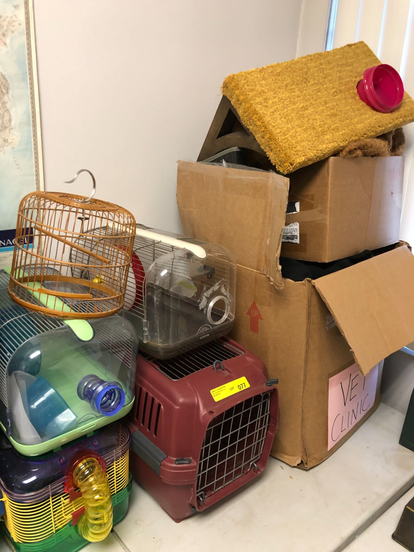 Pet Carriers, Hamster Cages, Bird Cage, Misc items from Pet Clinic from Turner & Hooch, carpeted cat feeding shelf plus box of coco basket liners
