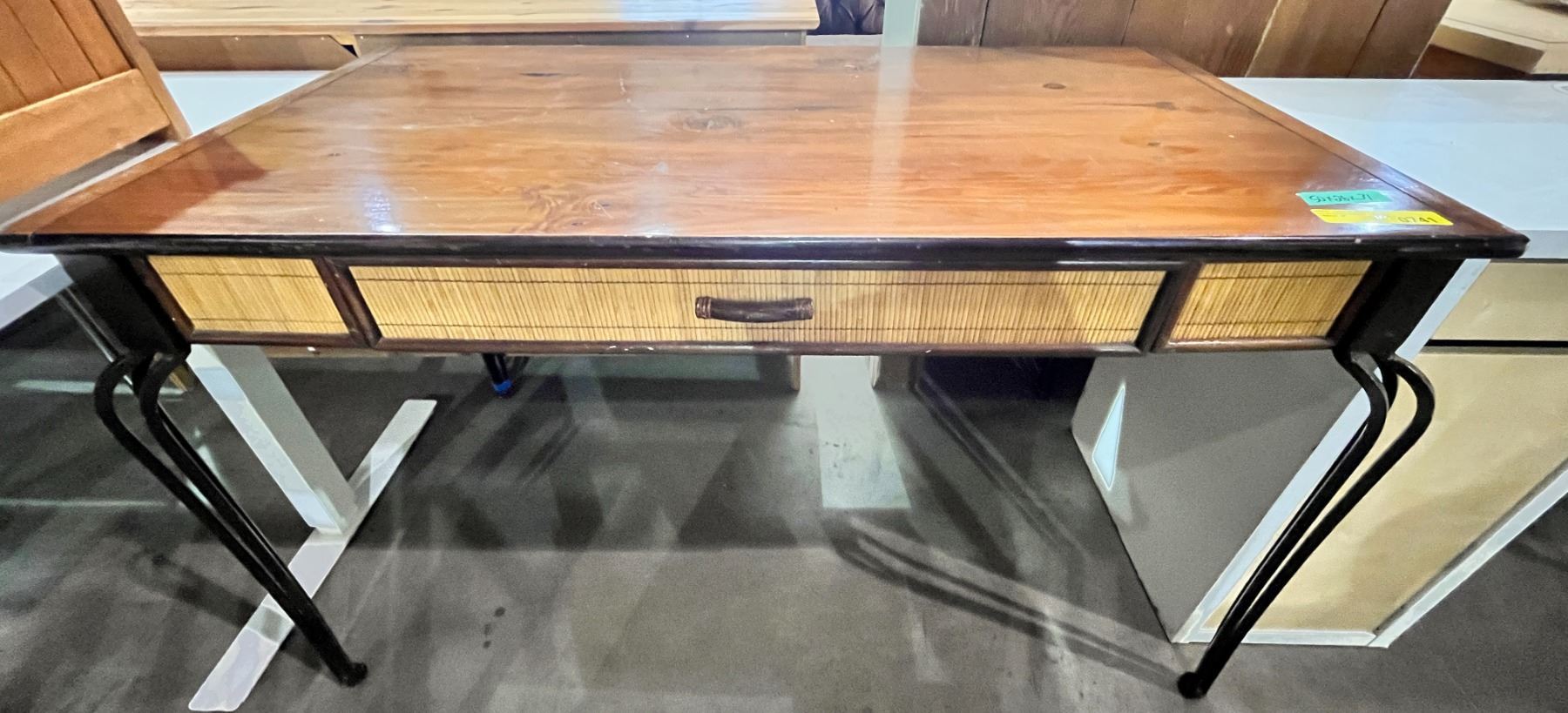 Pine & iron desk (approx. 50in W 26in D 31in H)