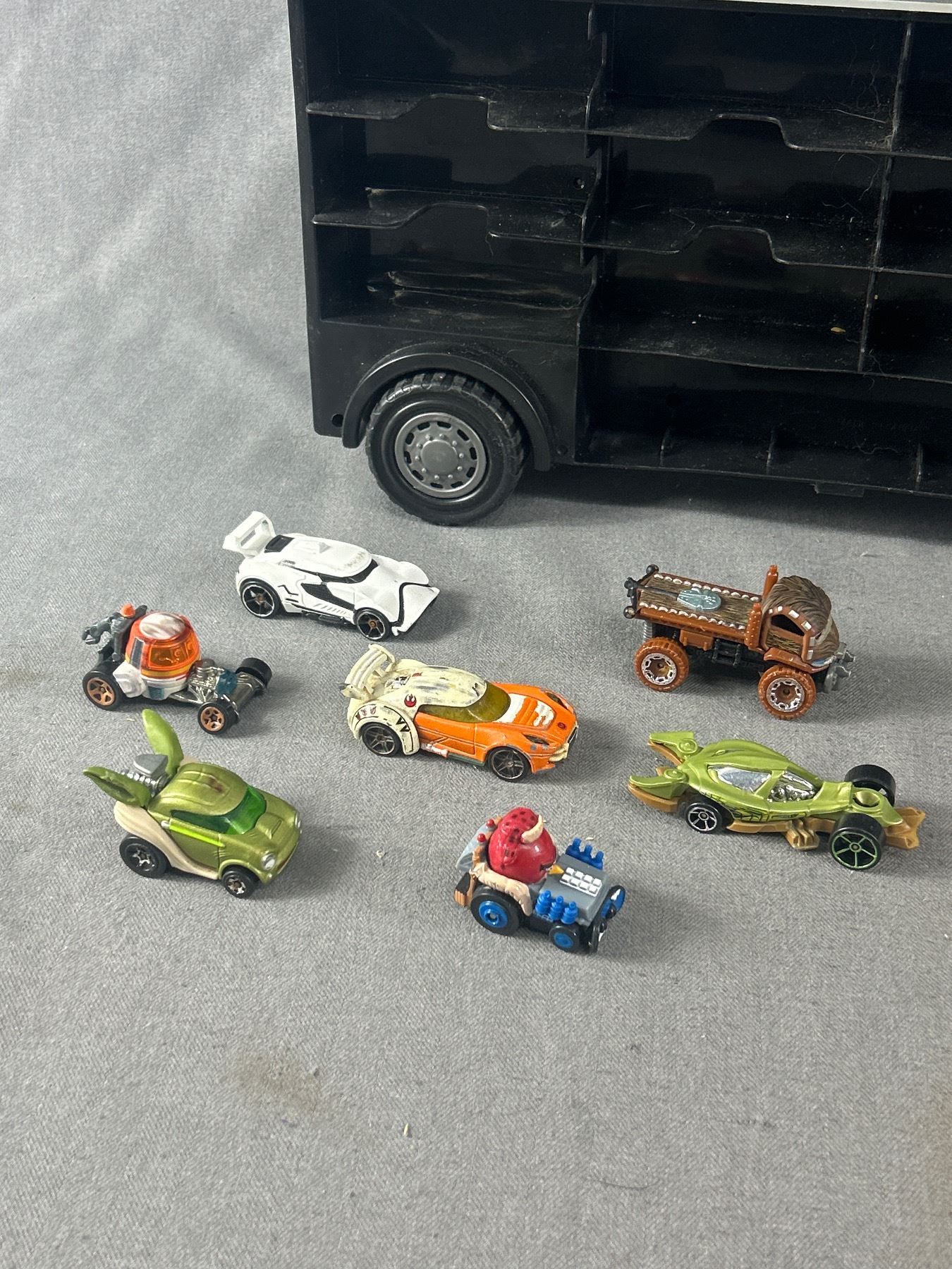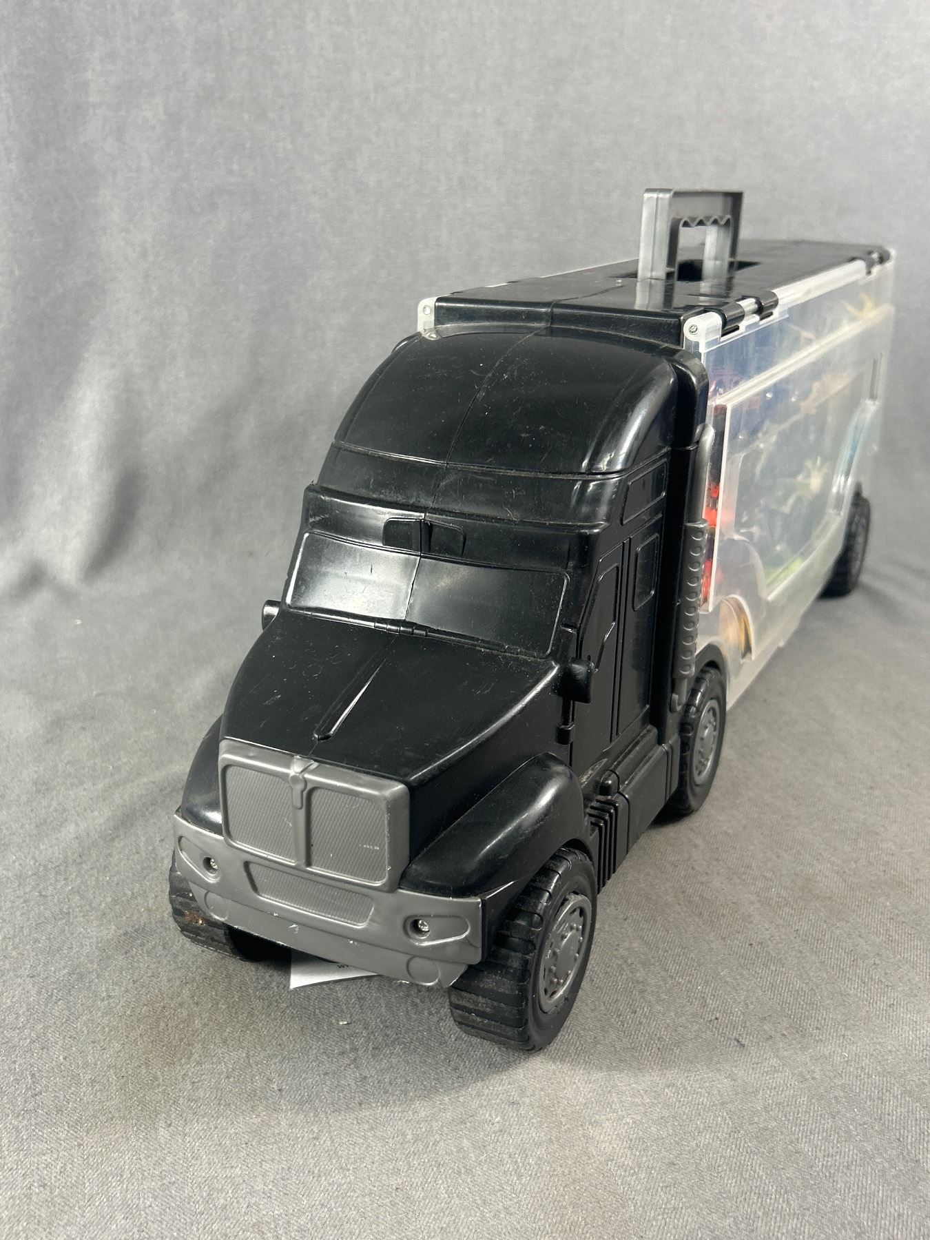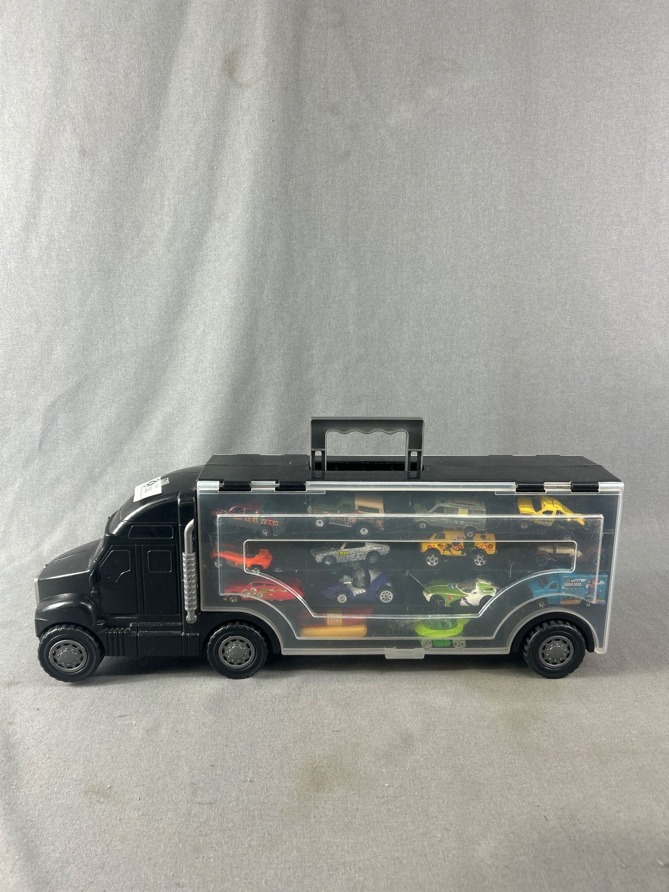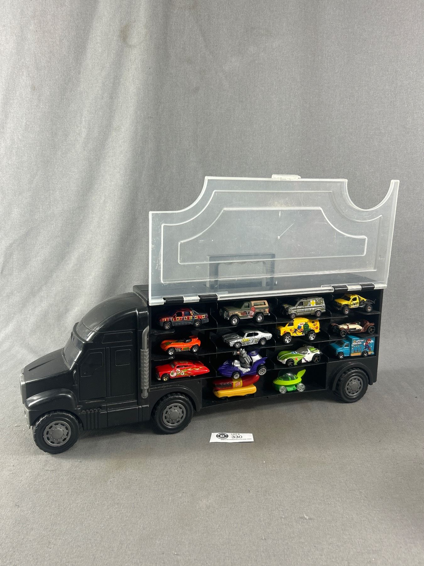 Plastic Transport Truck Approx. 22"L w/ Assortment Of Die-Cast Metal Collectible Cars