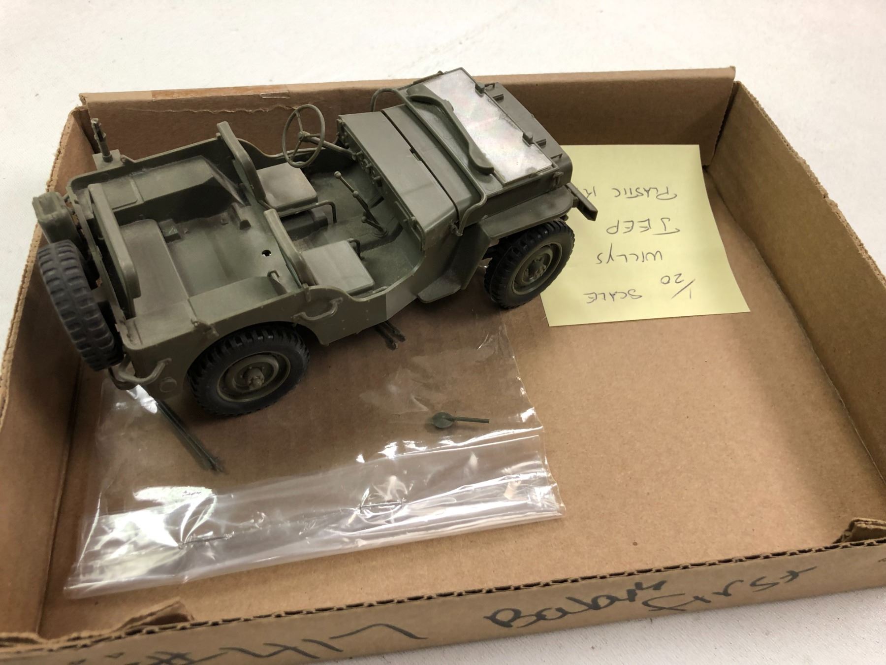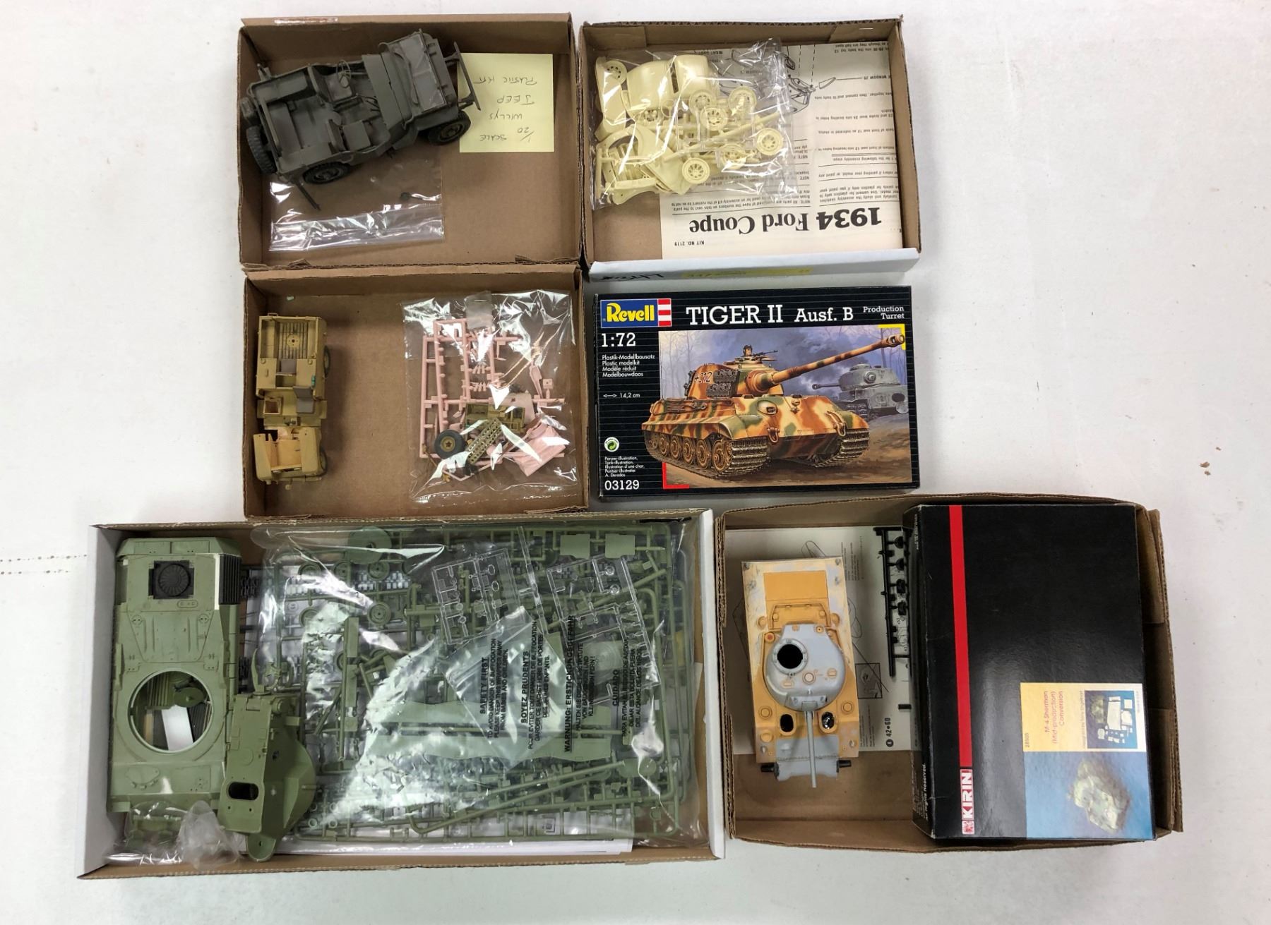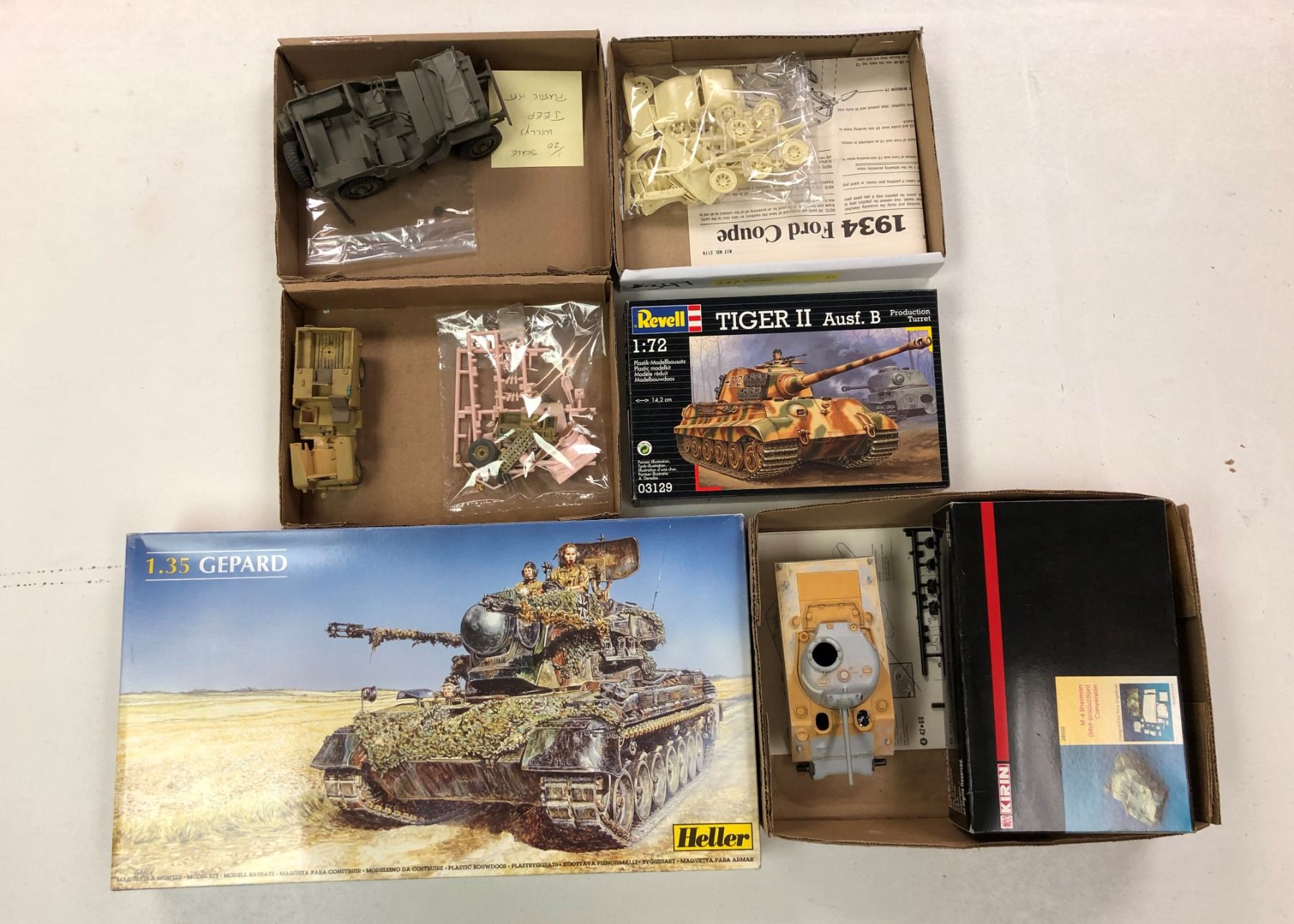 Plastic models some started some not / Various scales including Willies Jeep 1/20th scale, 1/35th scale, 1/72nd scale king tiger and kits