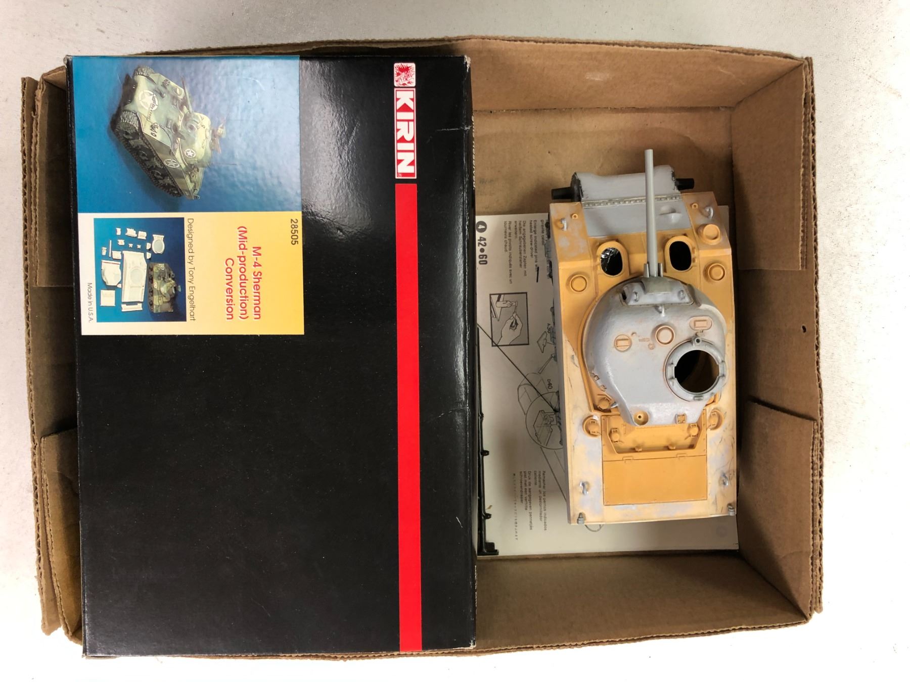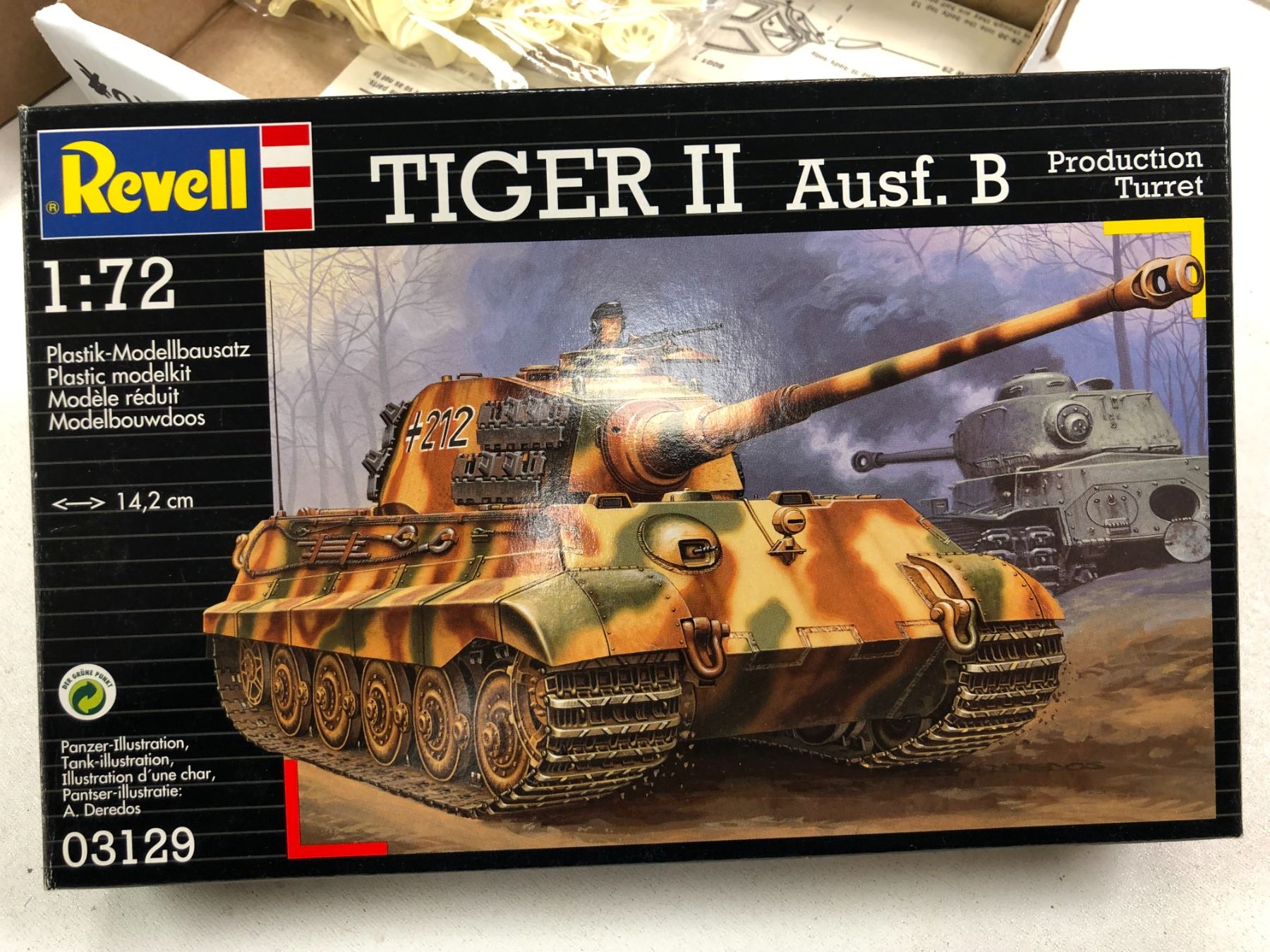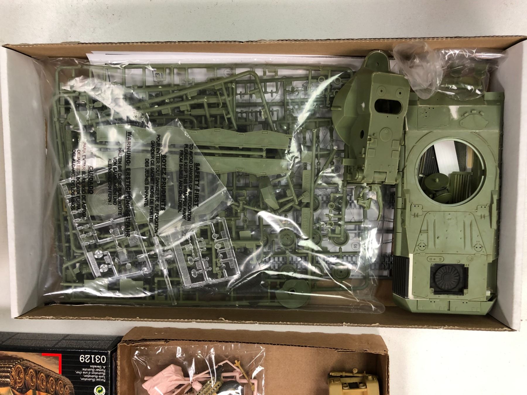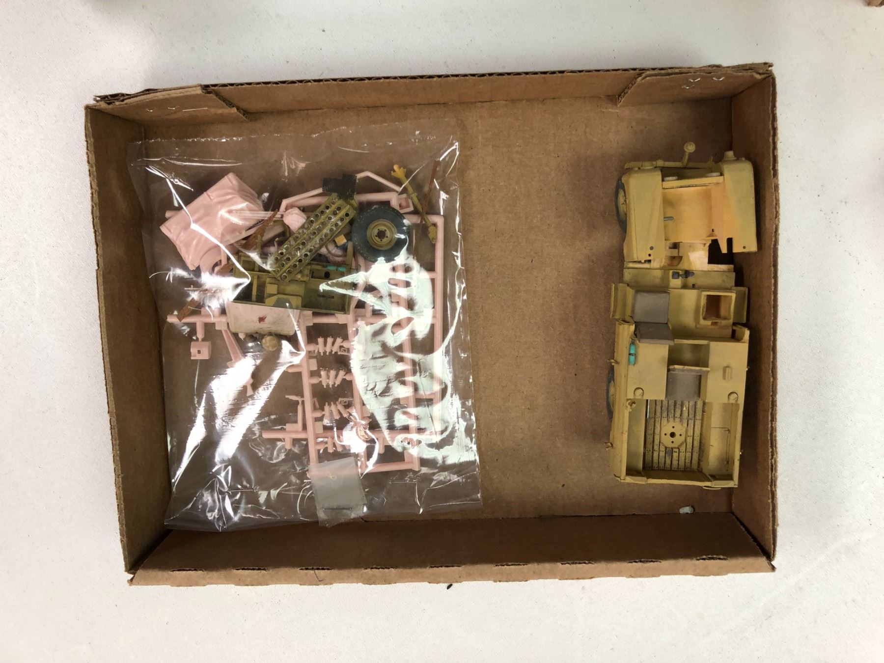Plastic models some started some not / Various scales including Willies Jeep 1/20th scale, 1/35th scale, 1/72nd scale king tiger and kits