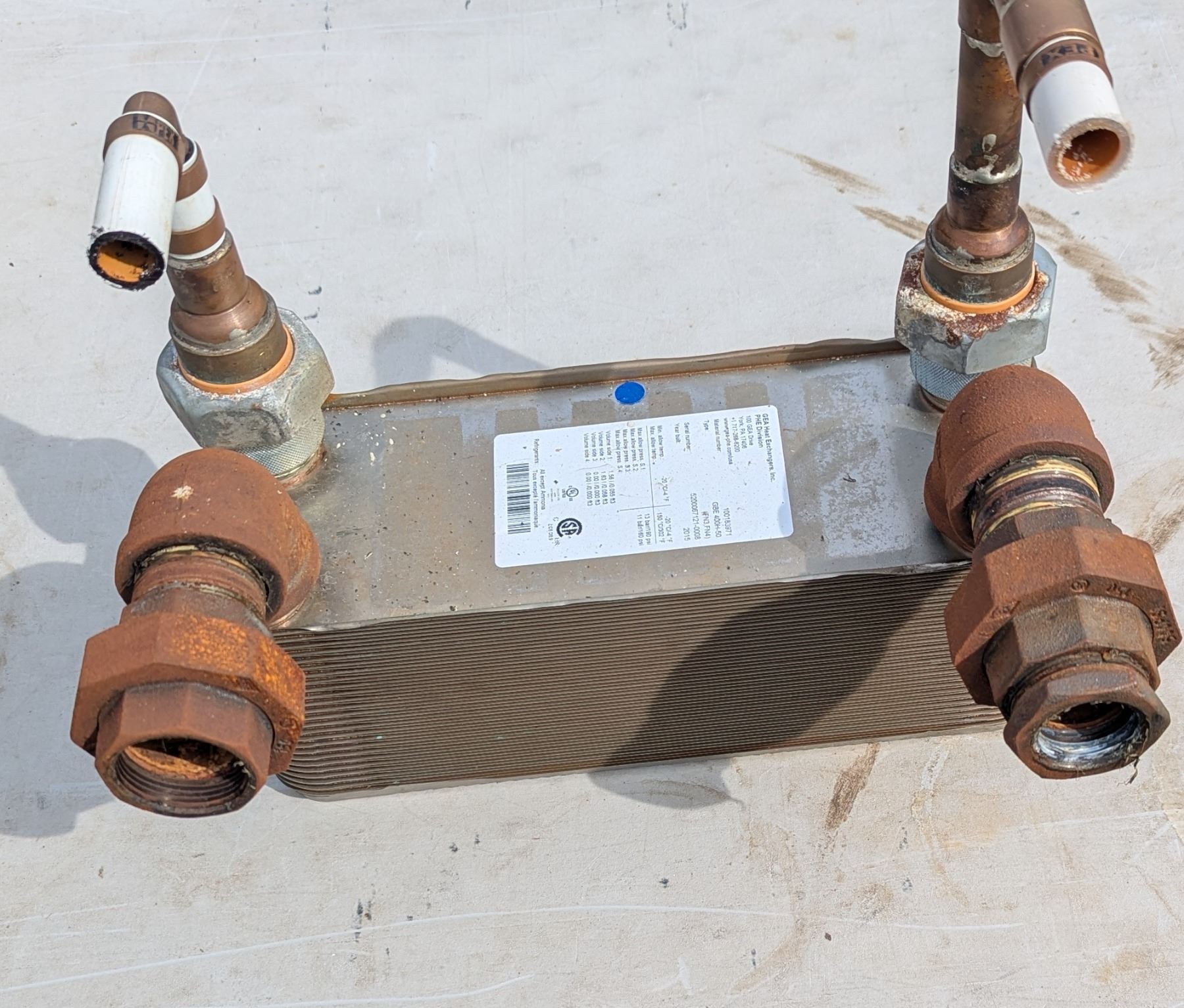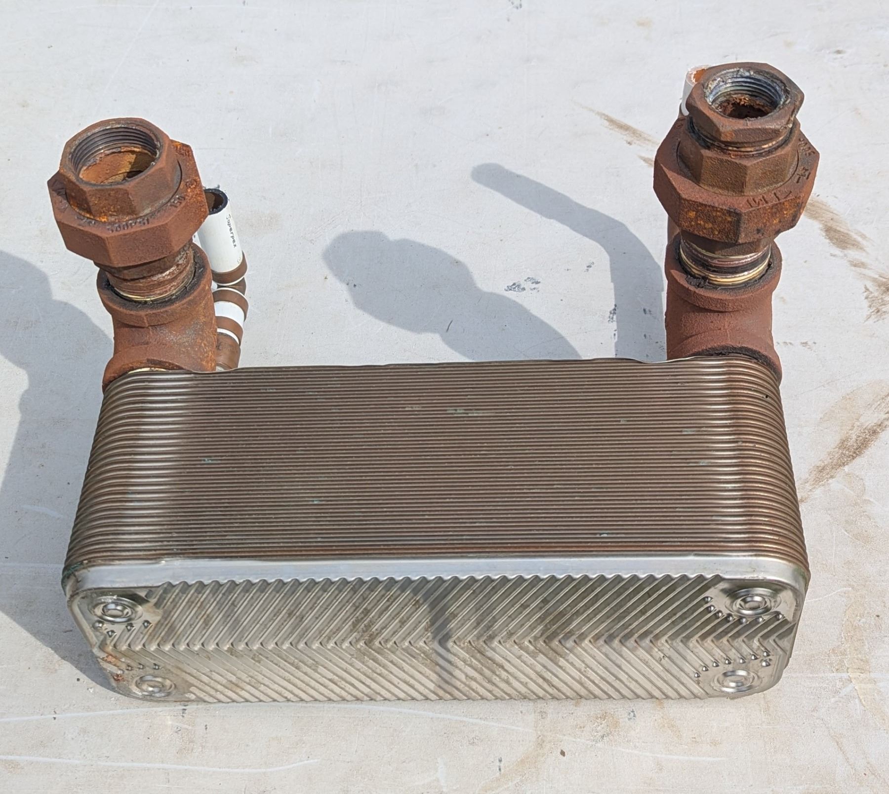 Plate heat exchanger. No holes. It works perfectly fine. Can turn a garden hose water to 72 degC with 80 degC supply water.