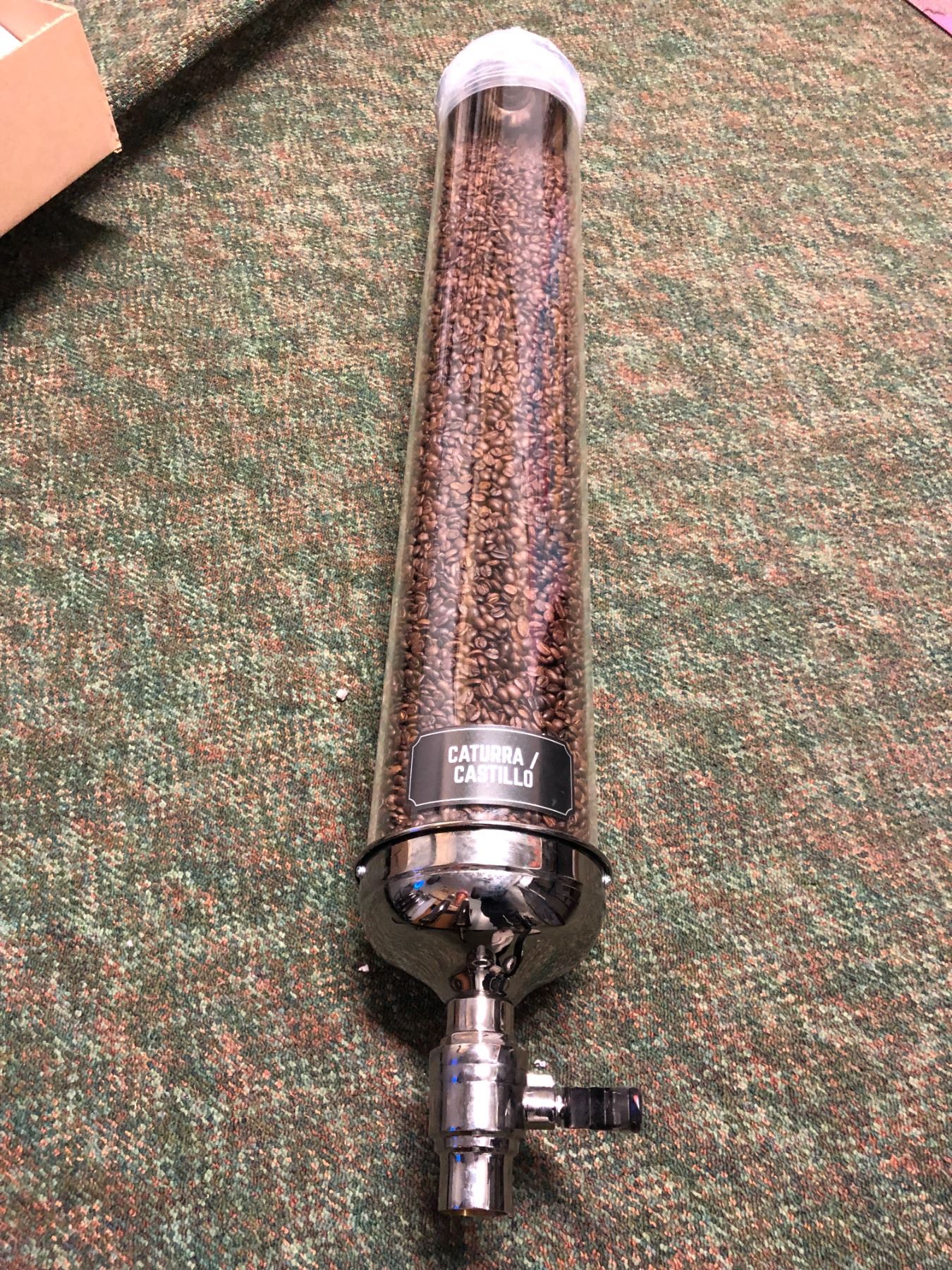 Plexiglass cylinder coffee bean dispenser filled with coffee beans from the Blockbuster partial animated movie - approx. 44in tall x 7in diameter