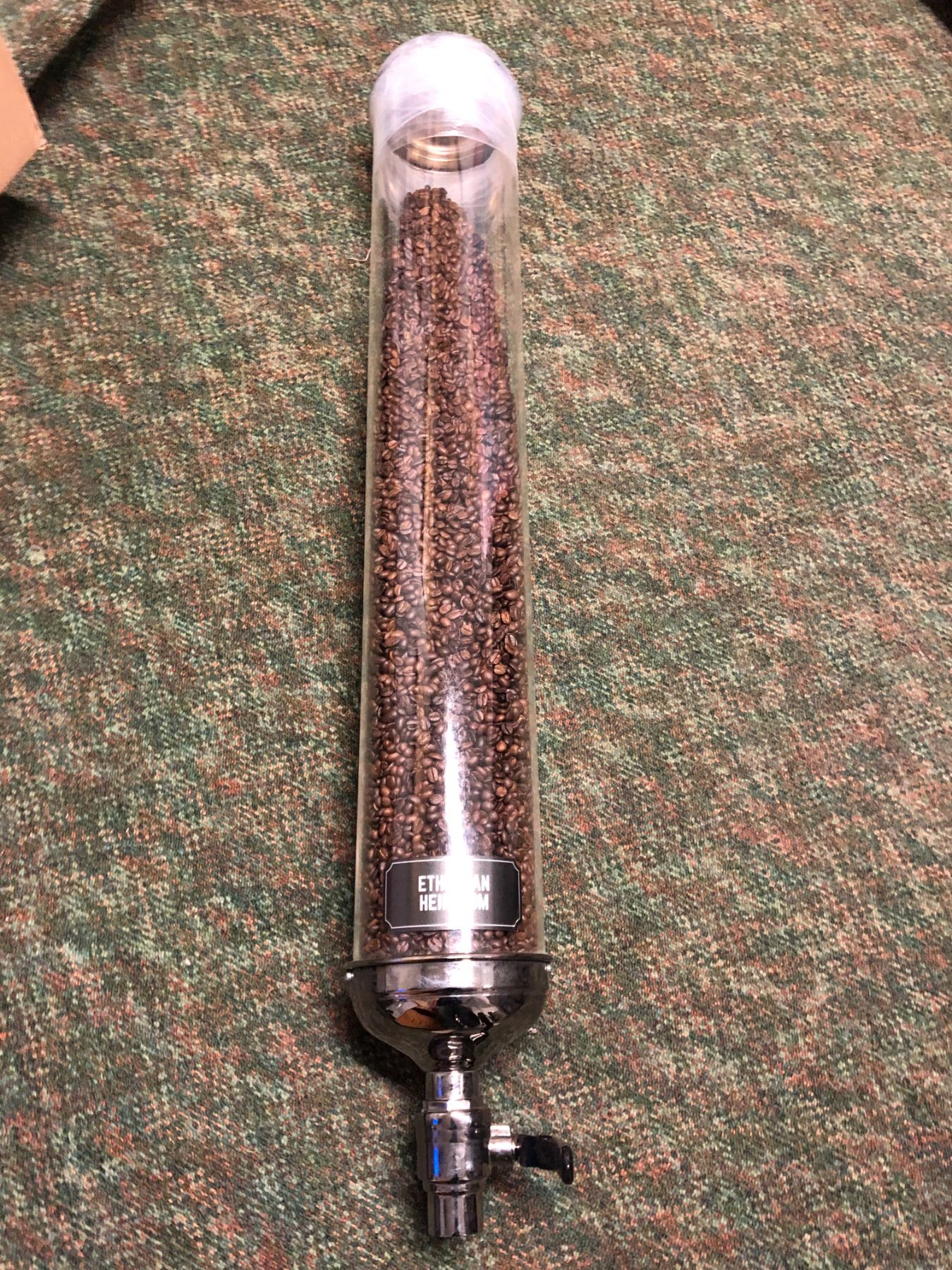 Plexiglass cylinder coffee bean dispenser filled with coffee beans from the Blockbuster partial animated movie - approx. 44in tall x 7in diameter