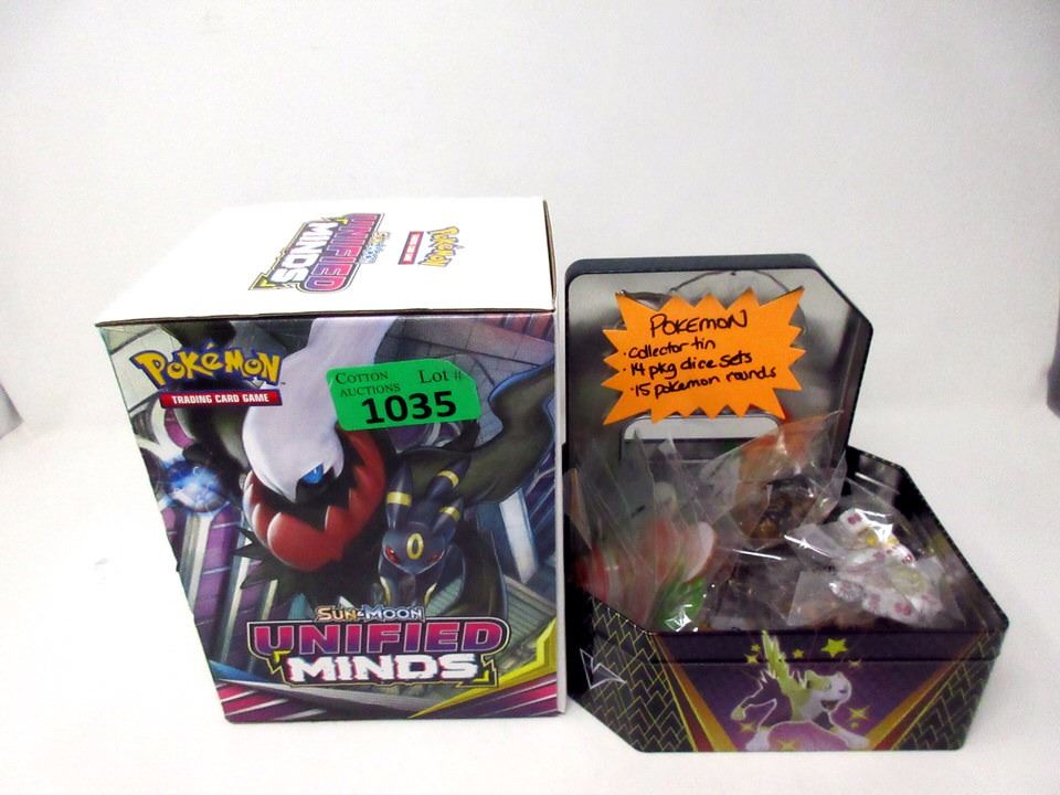 14 Packages of new dice sets, 15 new Pokemon rounds and a empty Sun & Moon Unified Minds display box,