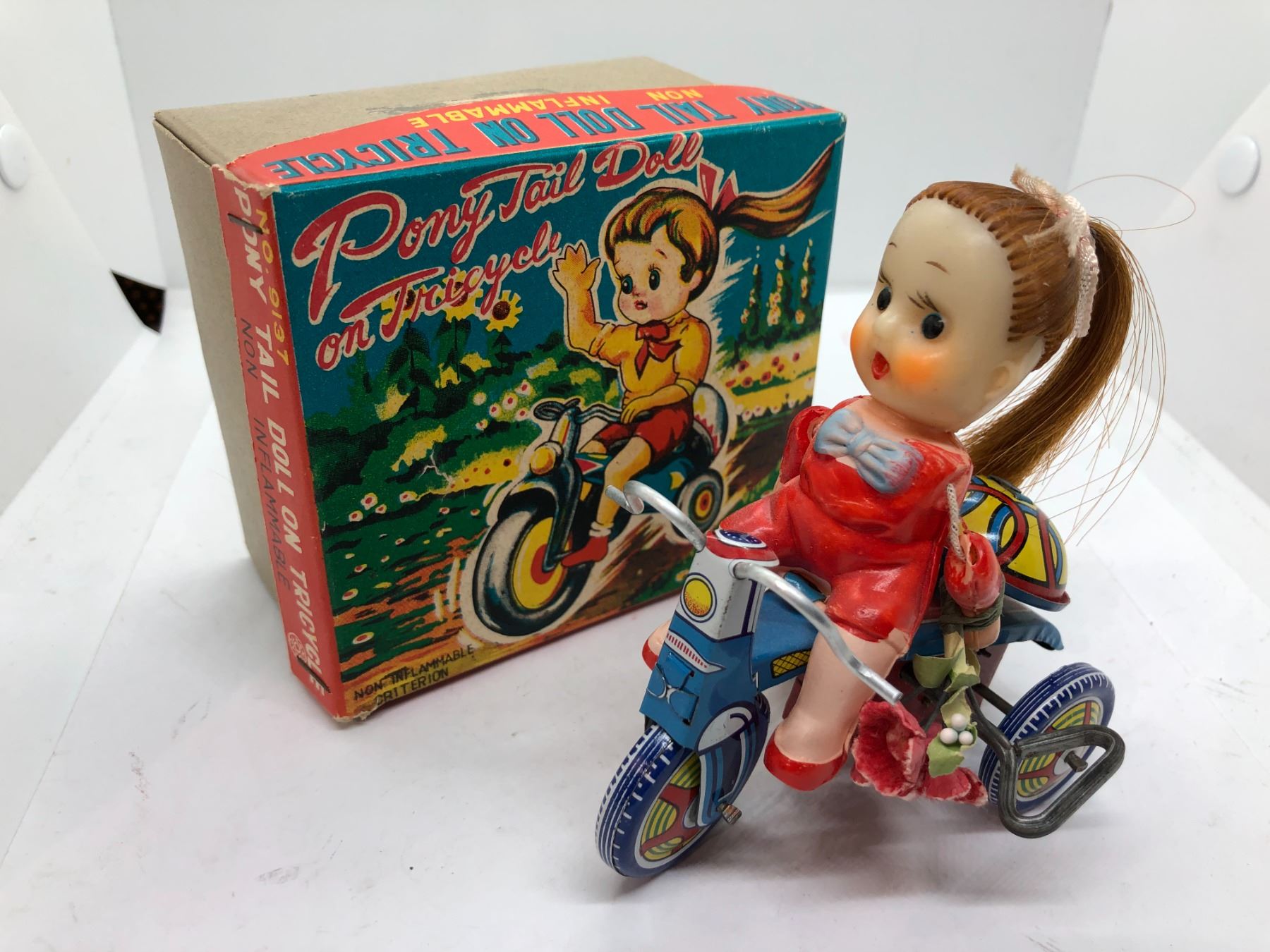 Ponytail doll on tricycle windup tin lithograph collectors toy XANTO toys Japan w/original box