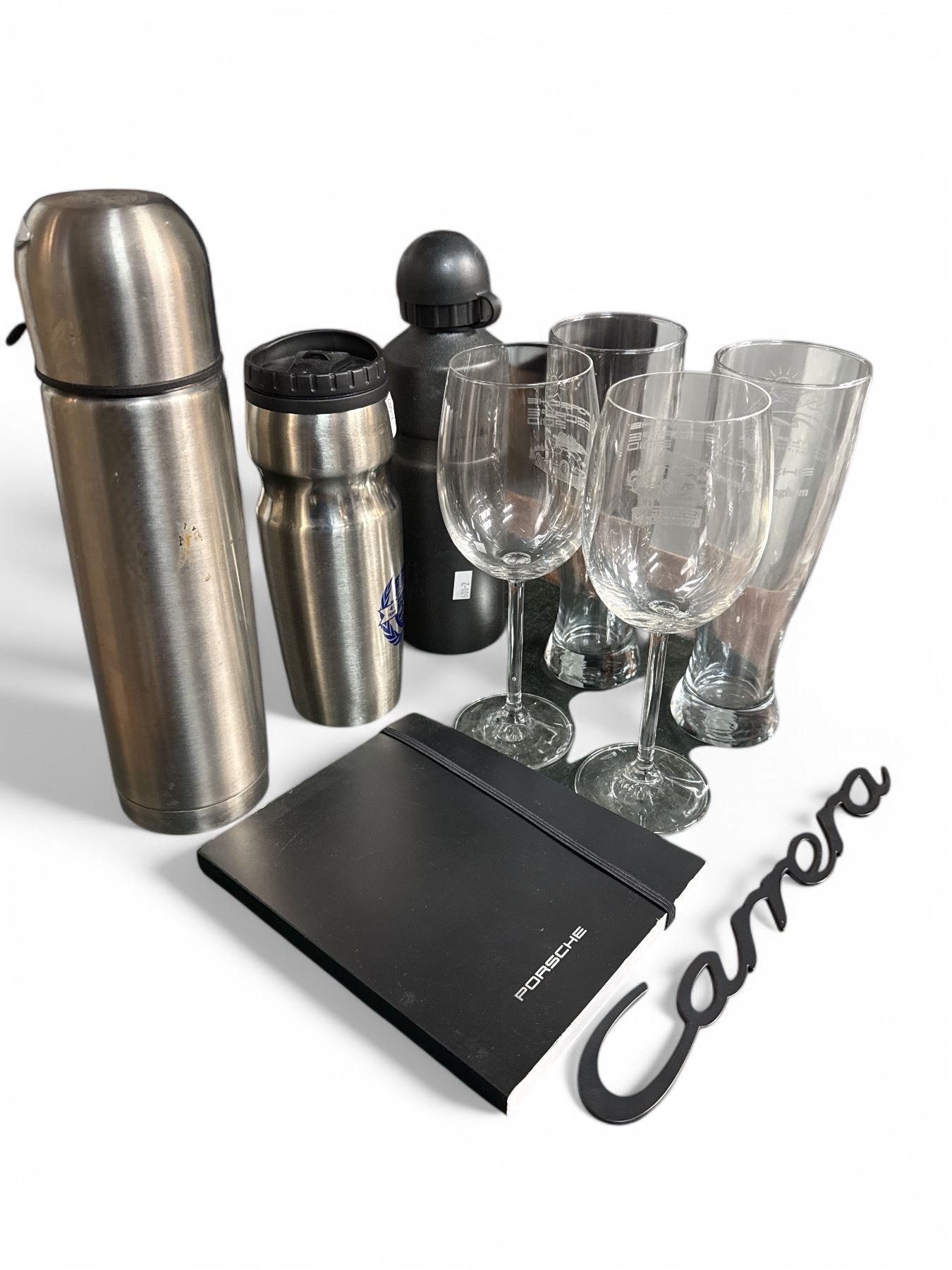 Porsche Collectibles: Writing Pad, Carrera Name Plate, Thermos, Bottles, & Glassware