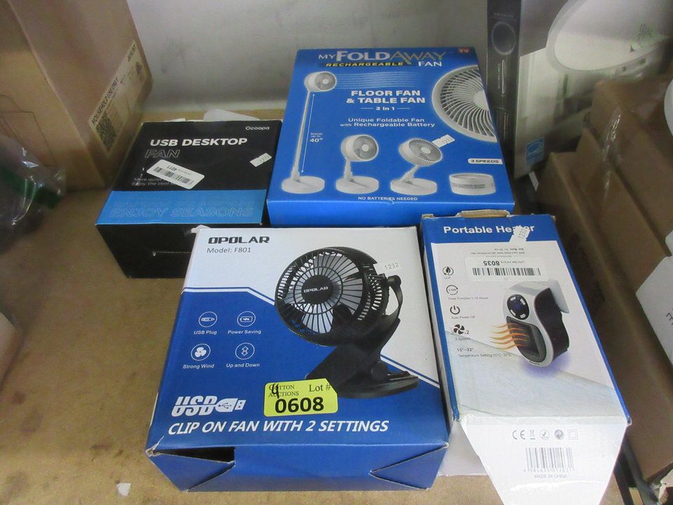 Portable heater, clip on fan, USB desktop fan and a floor fan/table fan set.