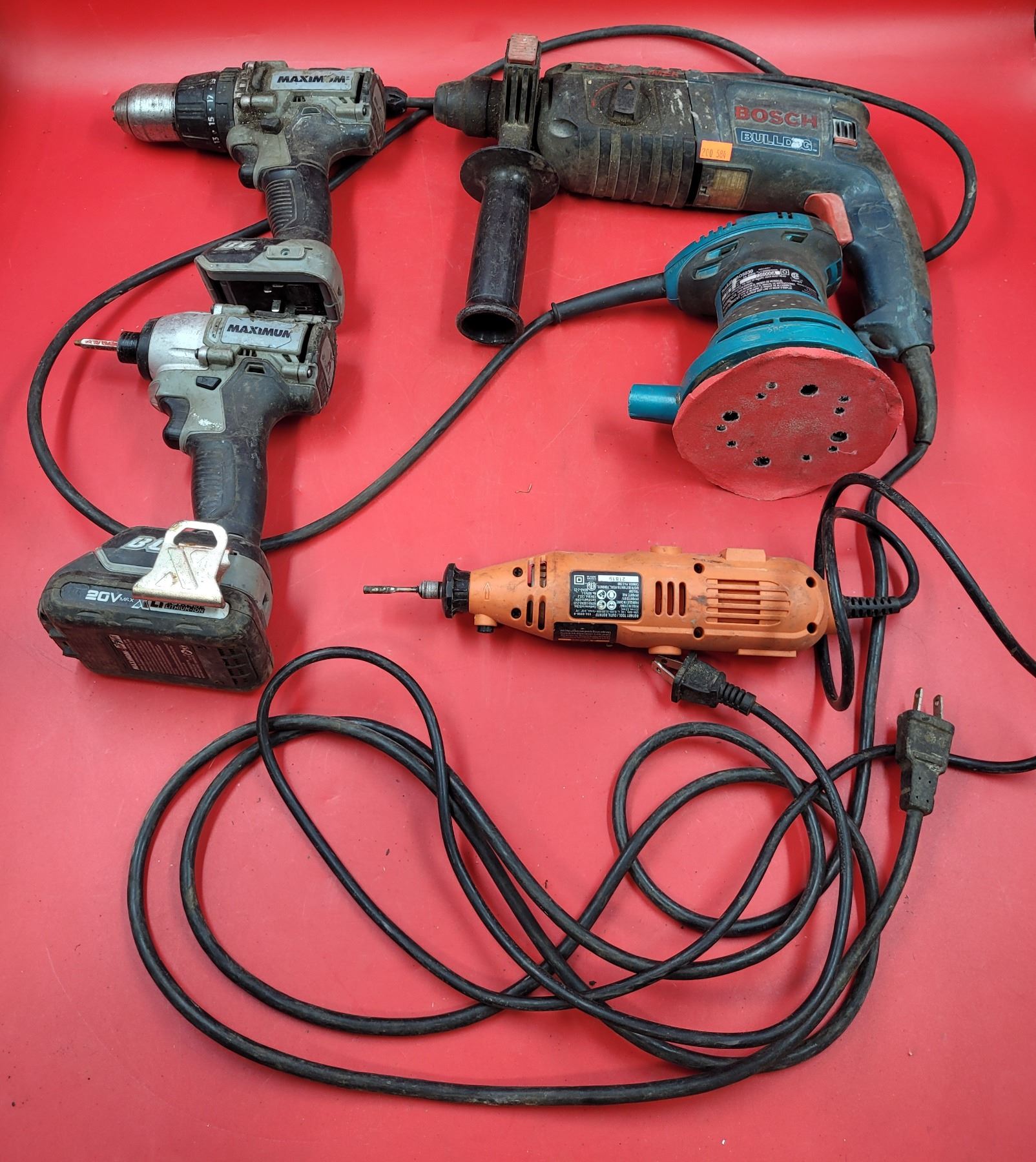 Power Tool Lot w/ Rotary Tool, Makita Sander, Bosch Rotary Hammer Drill, & 2 Maximum Drills