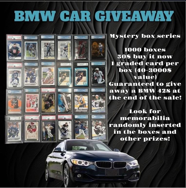 Premium mystery box values 50$ to 3000$ retail. Look for Wayne Gretzky Rookie cards. Memorabilia & Action money randomly inserted in boxes. See Auction description for vehicle giveaway details.