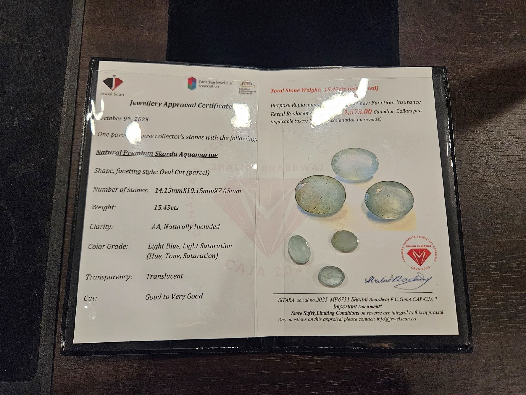 15.43ct total weight- 3 Skardu Aquamarine stones, oval shaped. Retail value $11,573.00
