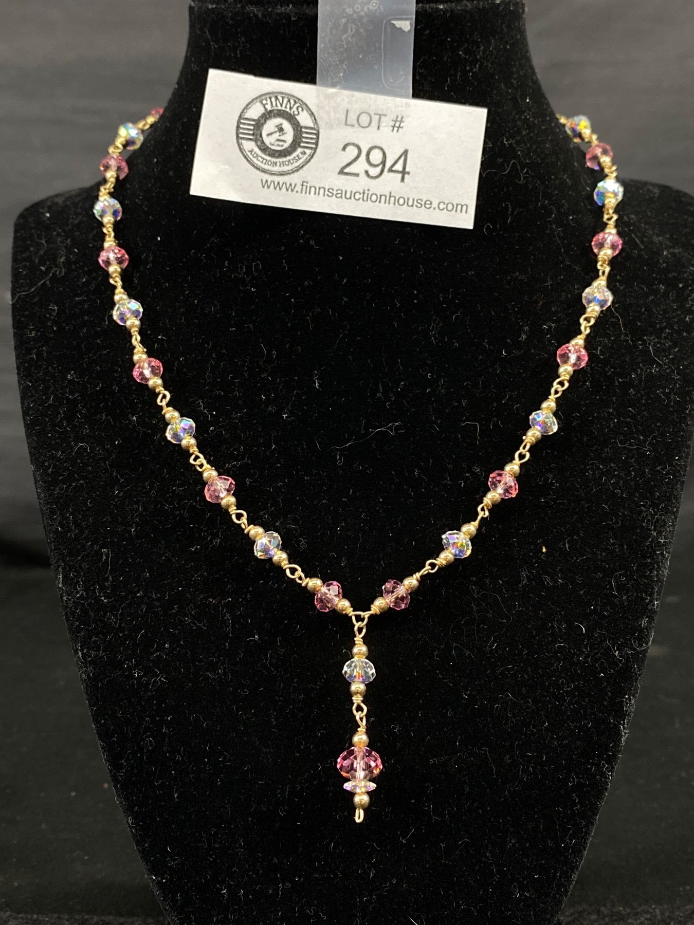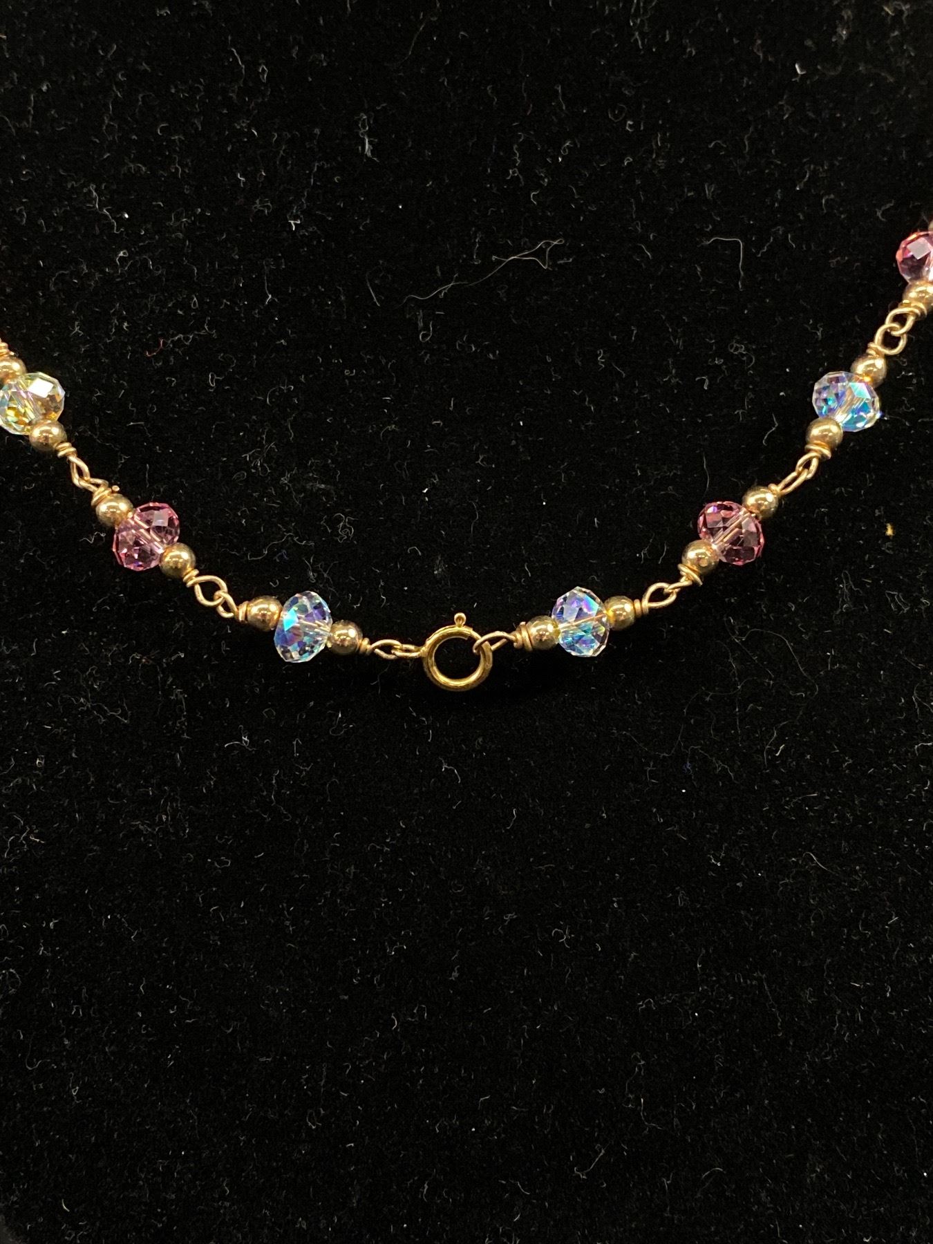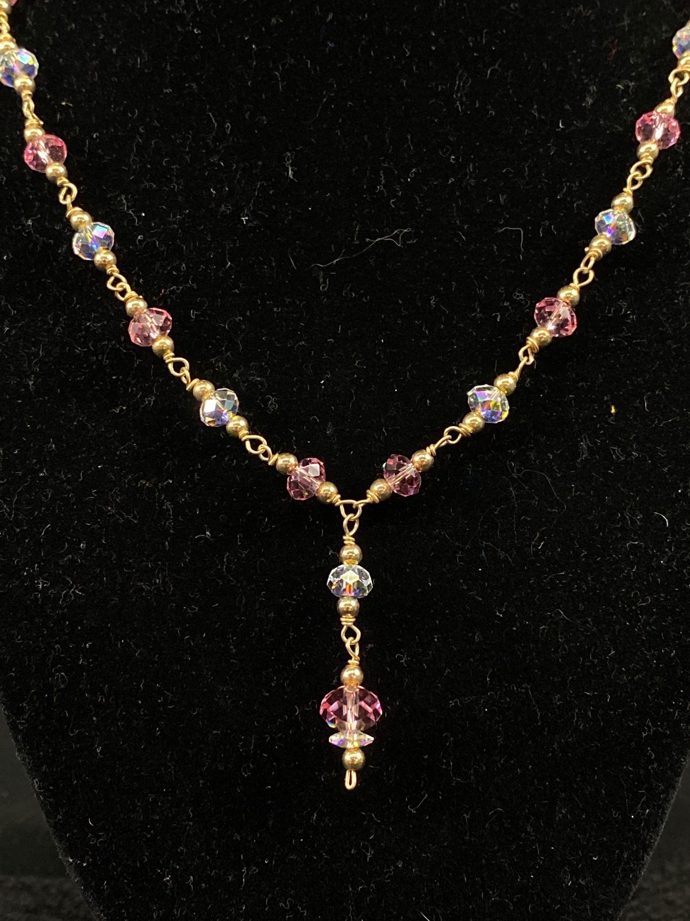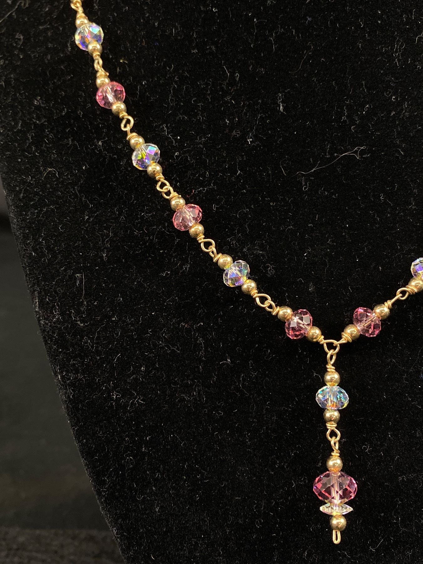 Pretty Dainty Gold Wire, w/Faceted Pink&White Crystal Glass Stone Beads Necklace
