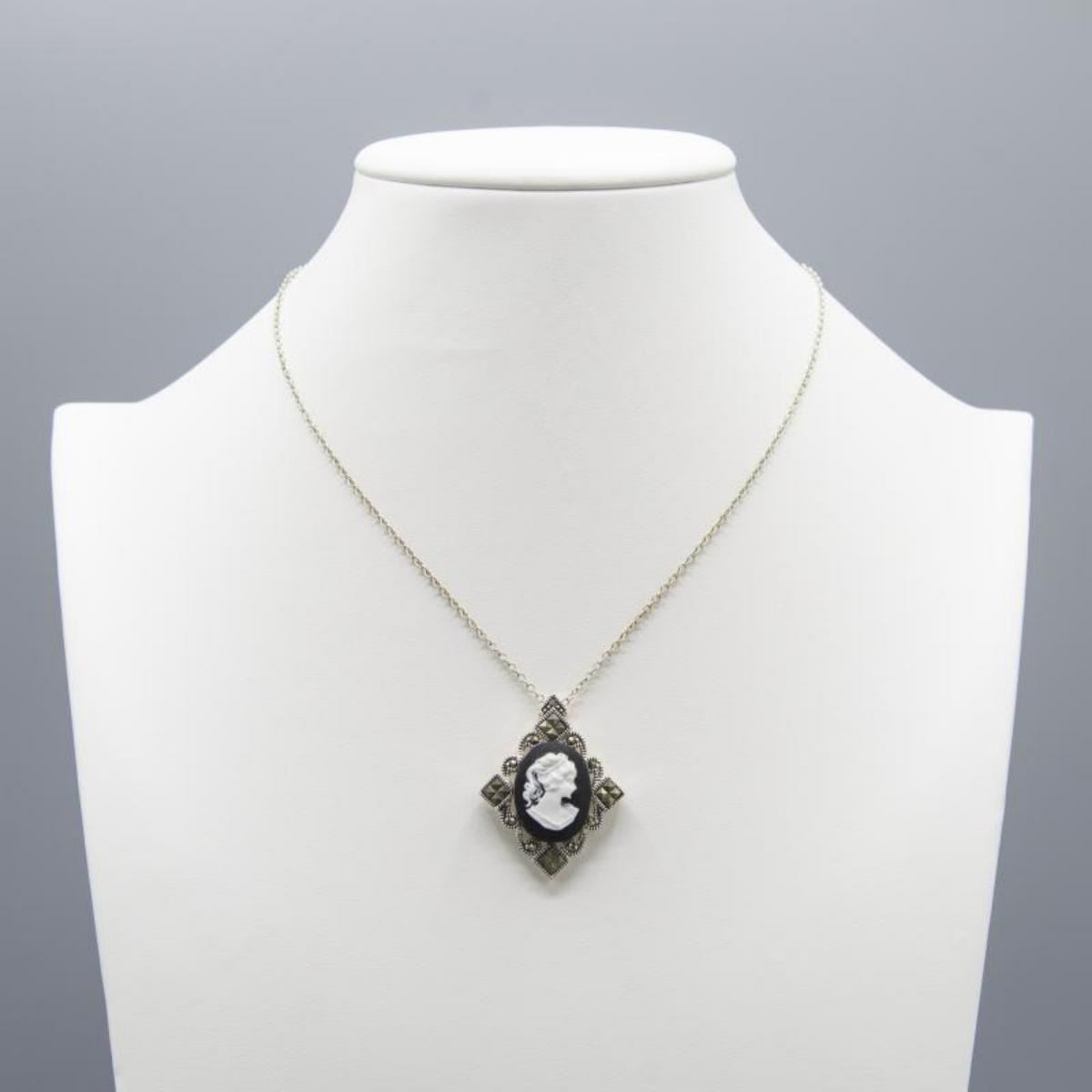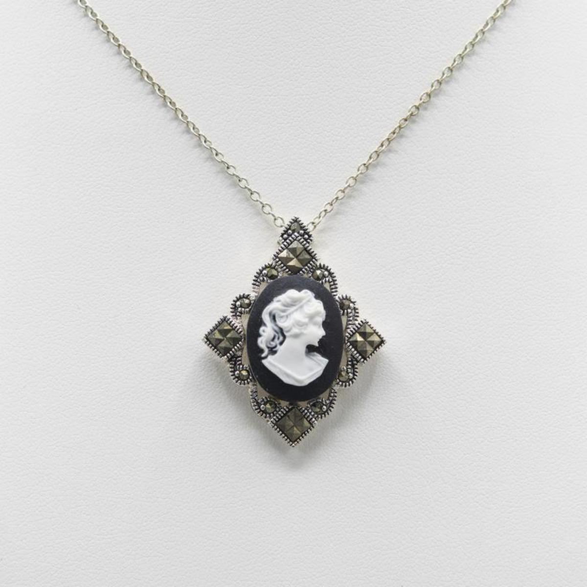 Pretty Vintage Cameo Pendant With Marcasite Accent Stones. Mounted in .925 silver overlay. Includes a 20" chain. 33.5 Cttw or 6.7 total gram wt.Classy pendant.