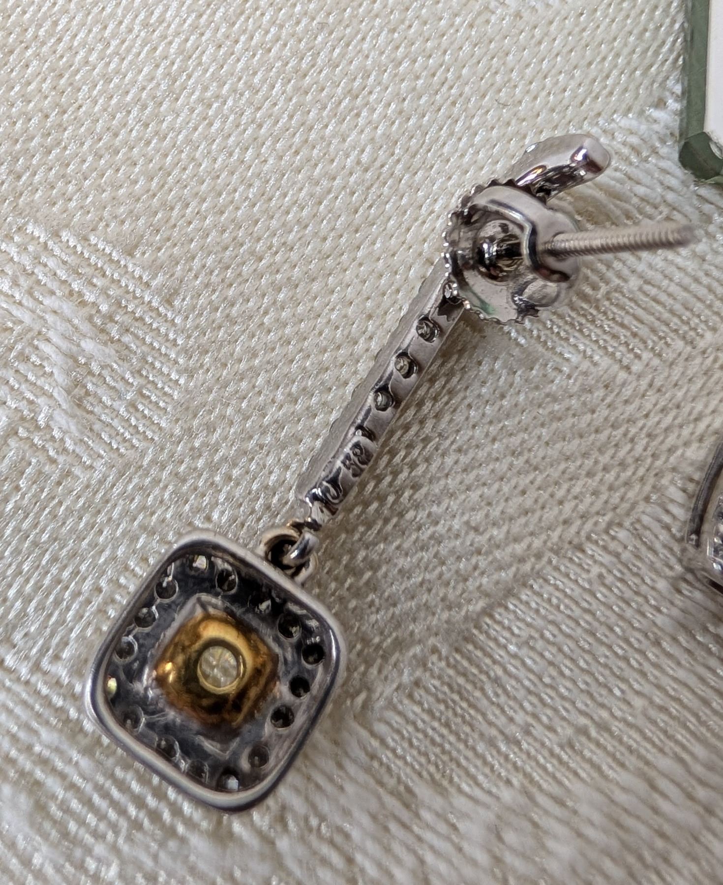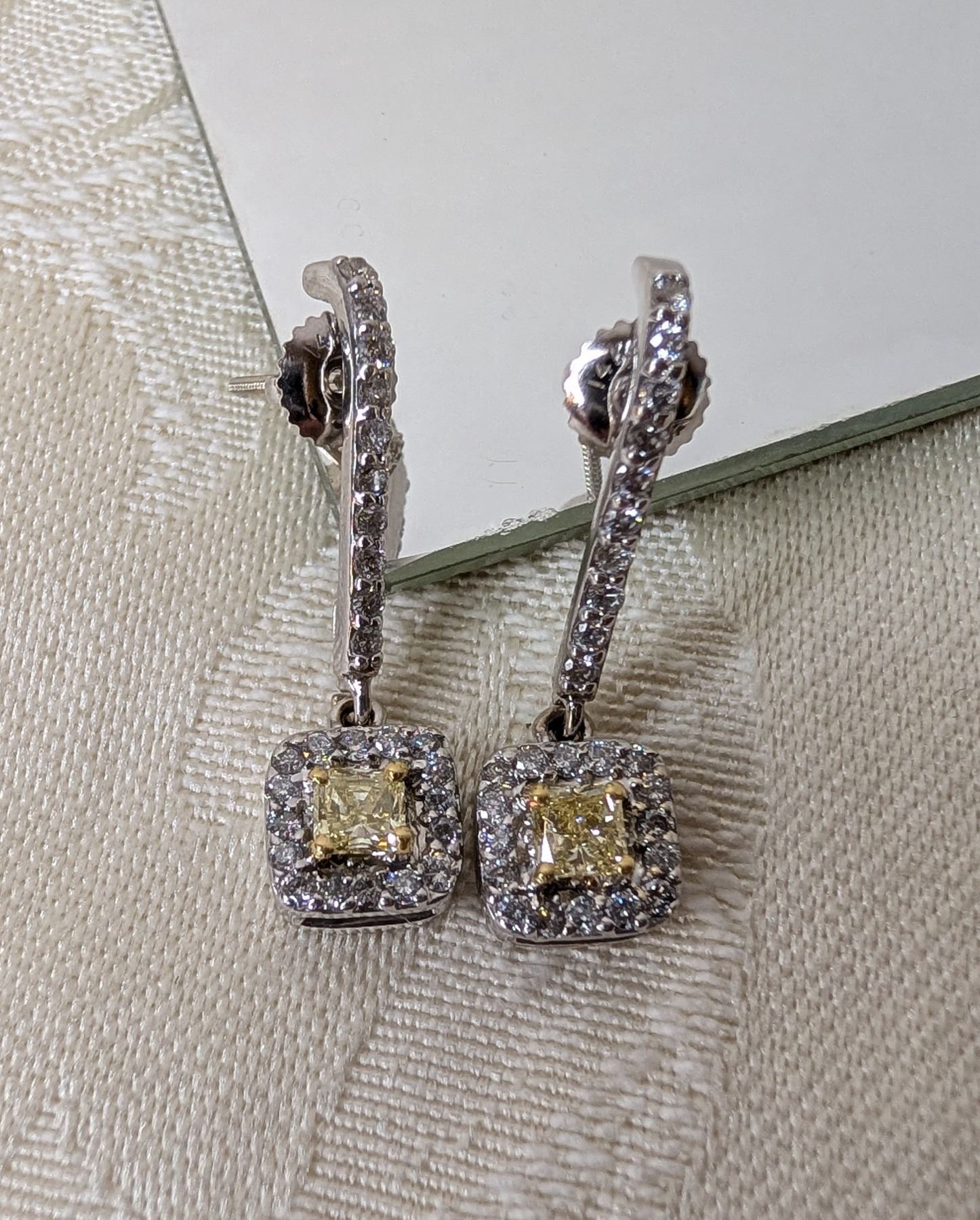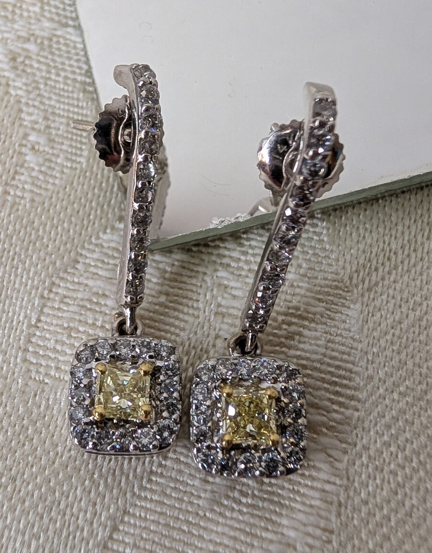Princess Cut Yellow Diamond and round white halo style drop stud, screw back earrings replacement value $8900