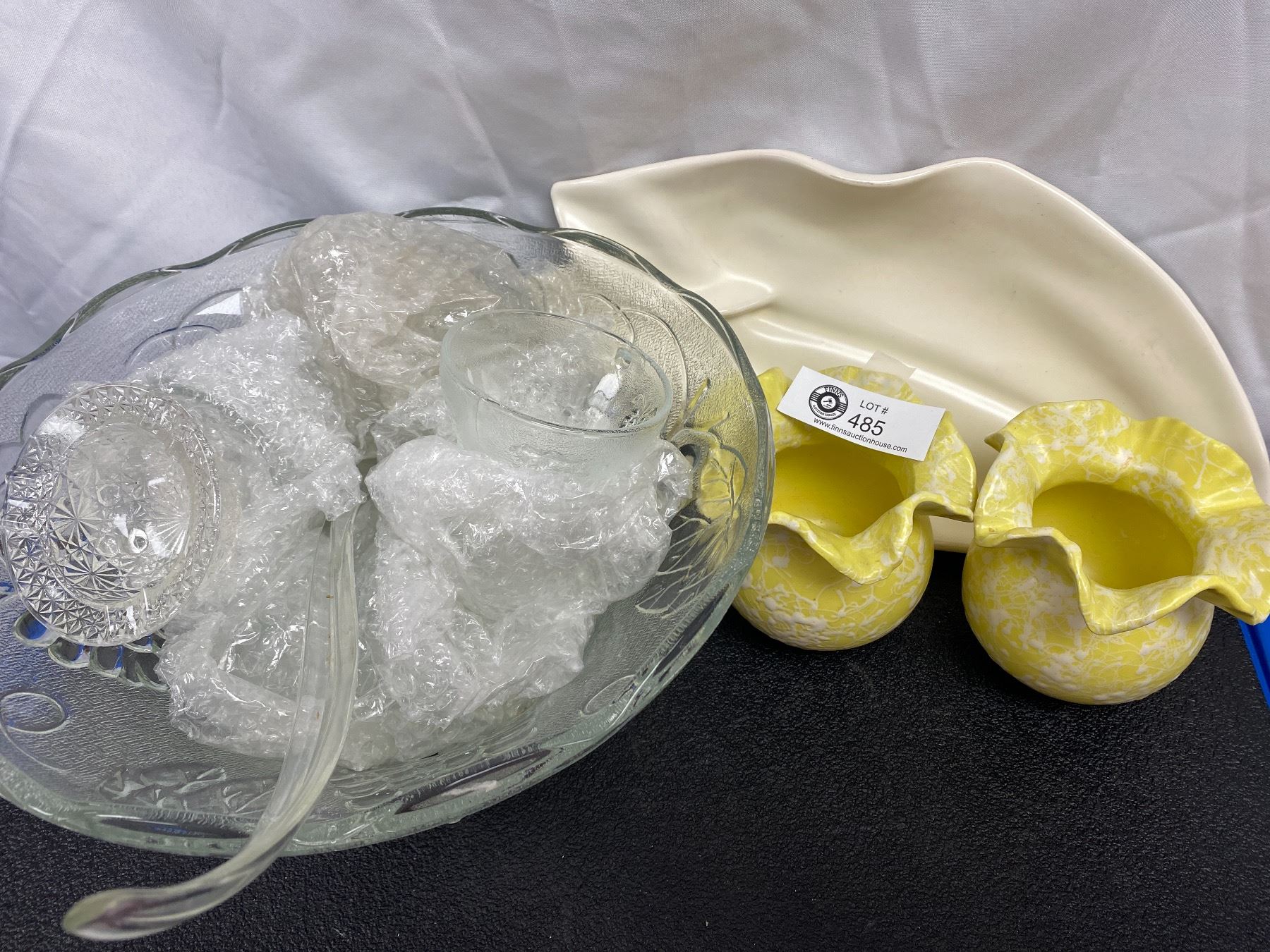 Punchbowl with Cups, A Tray and 2 Pottery Pieces ( Vases?)