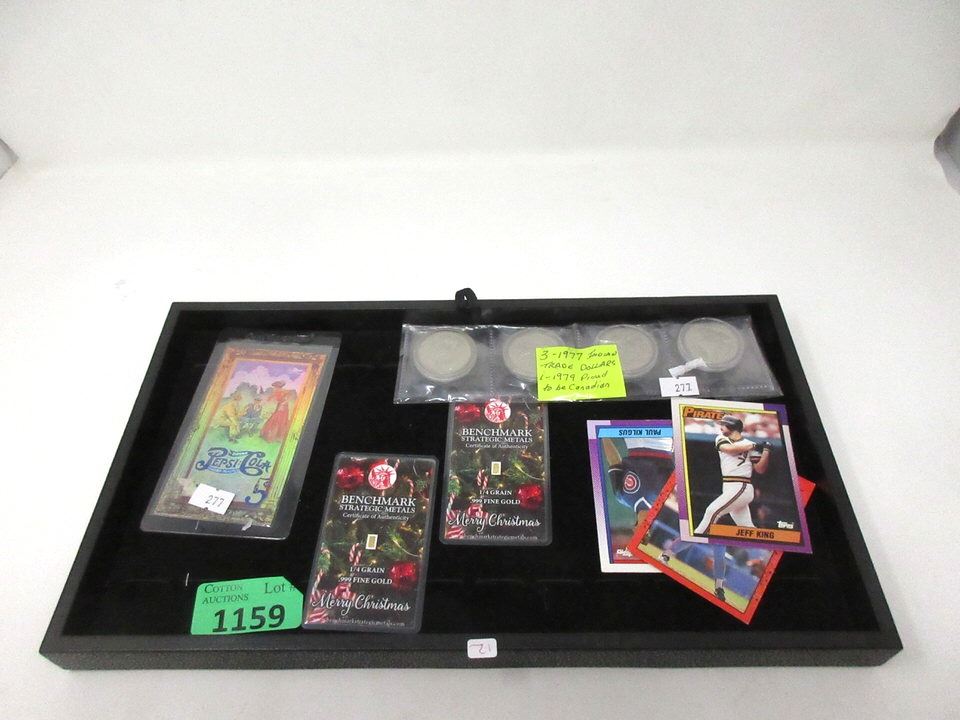 Two 1/4 Grain .999 Fine Gold Investor Tabs, Three 1977 Indian Heritage Coins & One 1979 Proud to be Canadian. Also includes 1994 Pepsi card & 3 Baseball cards.