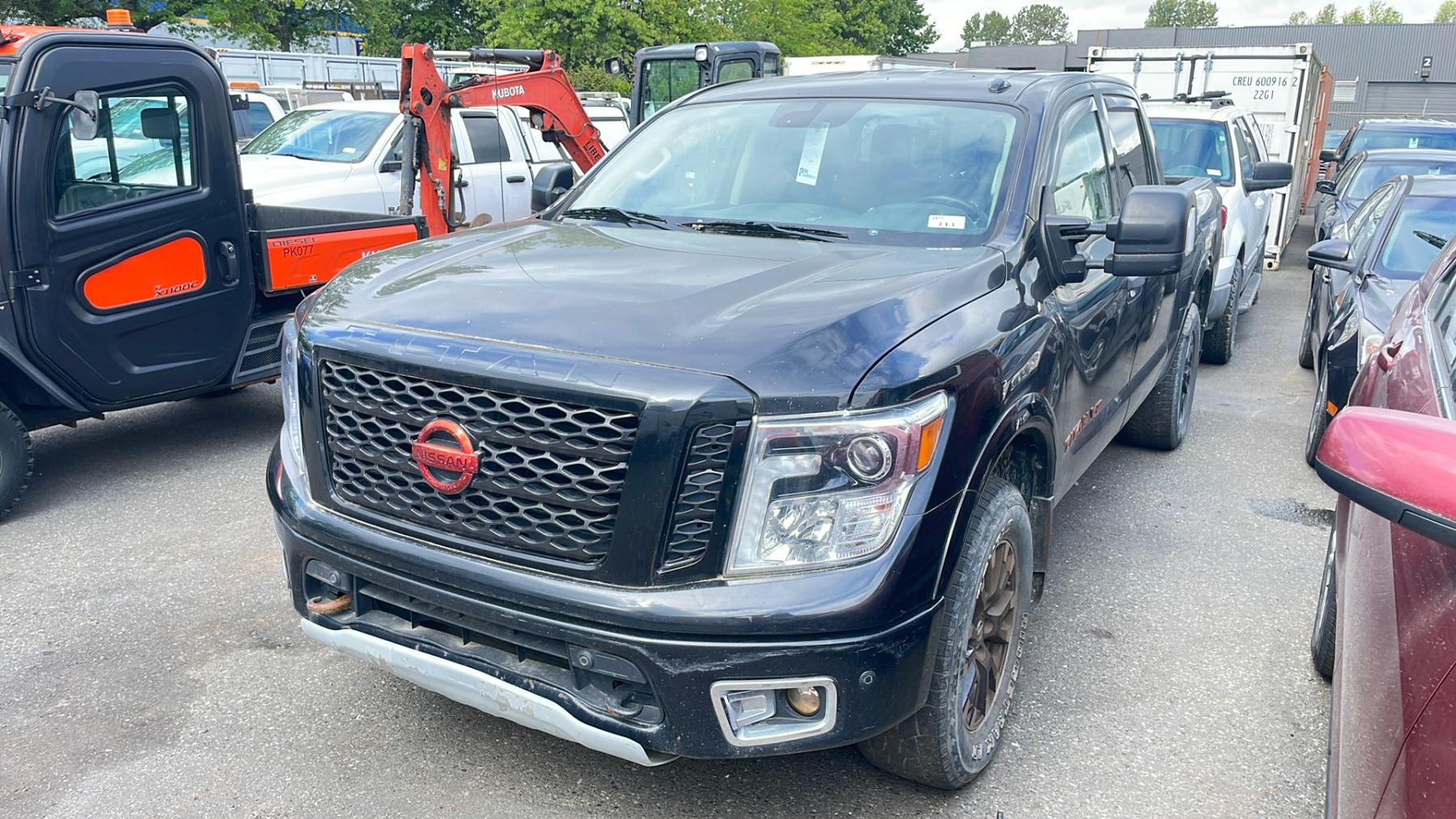 *R* 2018 NISSAN TITAN, BLACK, PICKUP, V8, GAS, BLACK, AUTOMATIC, VIN 1N6AA1E57JN536179, 107469KMS, RD,CD,PW,DV,CC,PS,TH,PL,TW,4W,AC, BROKEN D/S WINDOW & REAR VIEW MIRRORS, SCRATCHES ON D/S AND P/S DOORS, BIG SCRATCHES ON P/S FRONT WHEEL WELL, DENT AND SCRATCHES ON ROOF, SCRATCHES ON TAILGATE, PAINT CHIPS ON GRILL, GOUGES IN PLASTIC AROUND BOX, MISSING FOGLIGHT, NO ICBC DECS