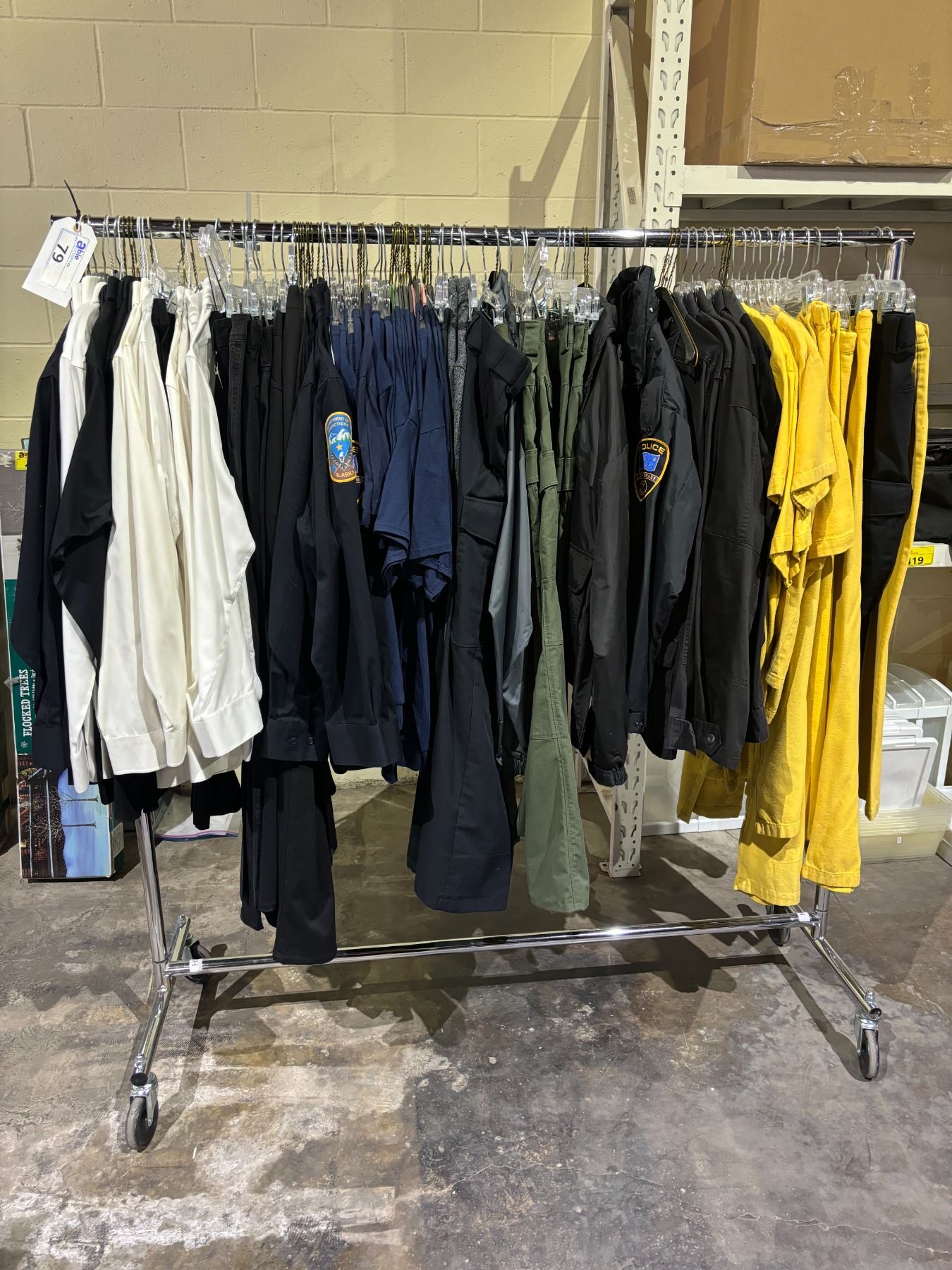 RACK OF ASSORTED CLOTHING INCLUDING; EMERGENCY PERSONNEL UNIFORMS, BUTTON DOWN SHIRTS, PANTS & MORE (RACK INCLUDED)