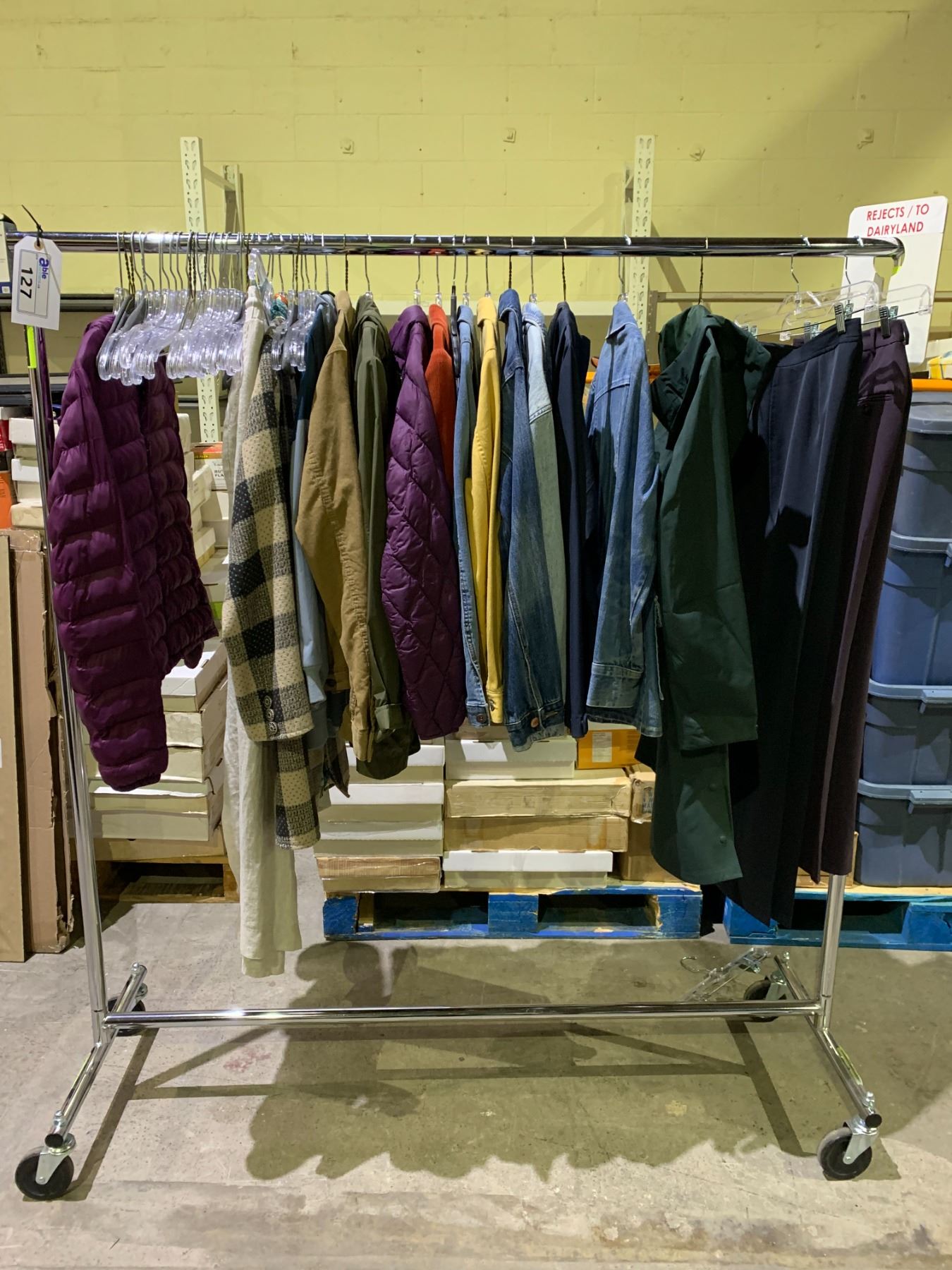 RACK OF ASSORTED CLOTHING INCLUDING; JACKETS, PANTS & SWEATERS (RACK INCLUDED)