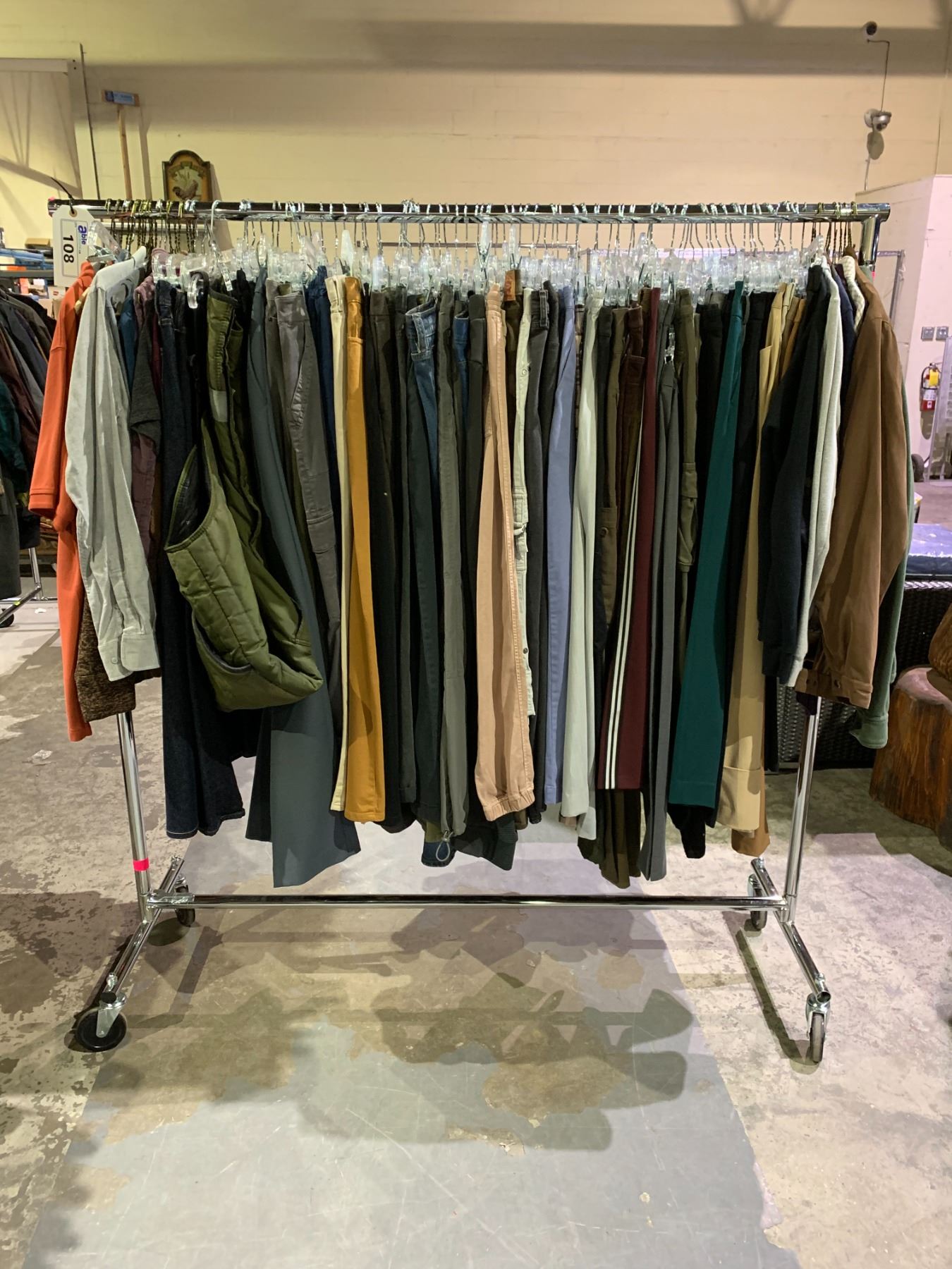RACK OF ASSORTED CLOTHING INCLUDING; PANTS, SHIRTS, JACKETS & MORE (RACK INCLUDED)