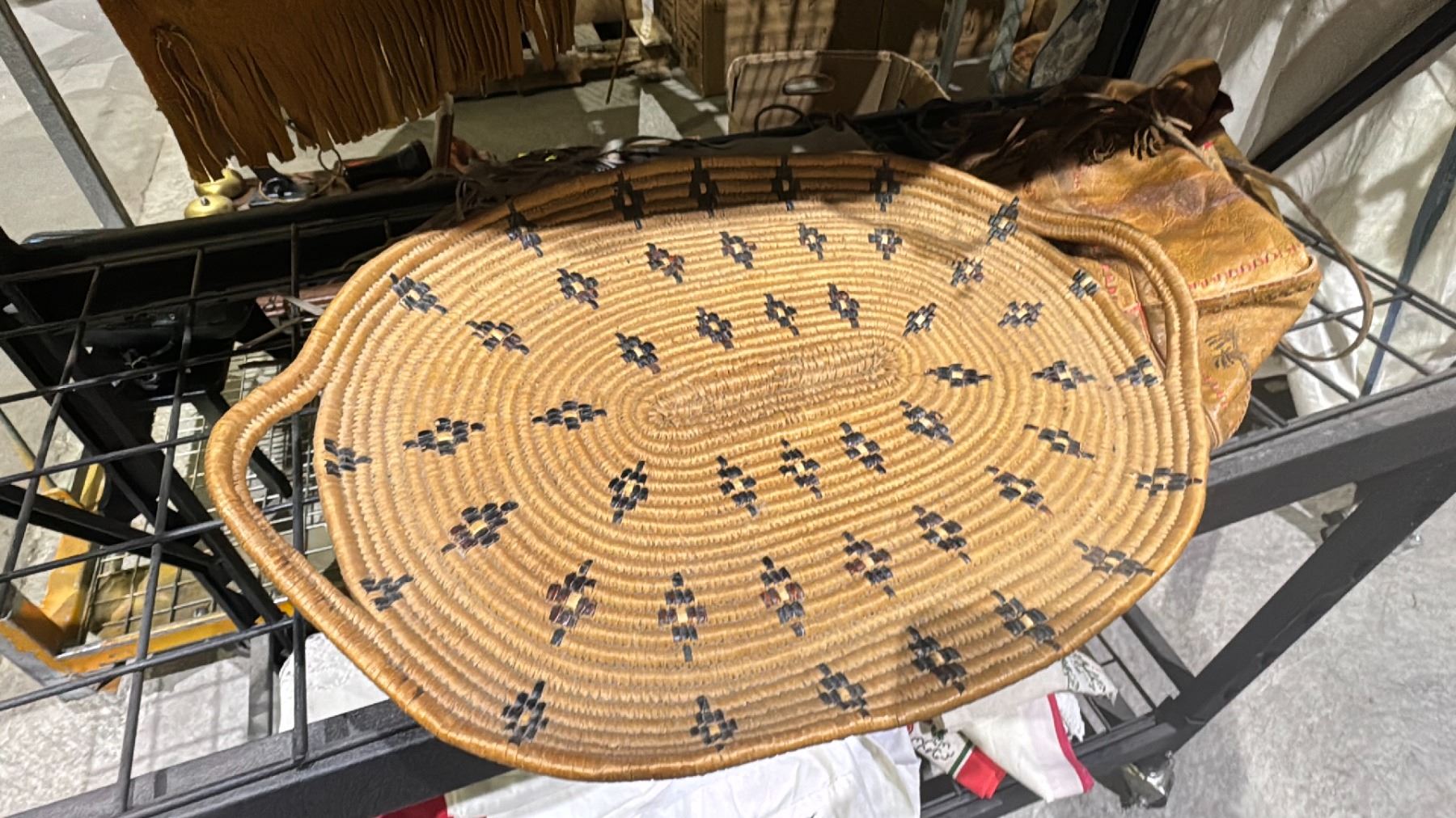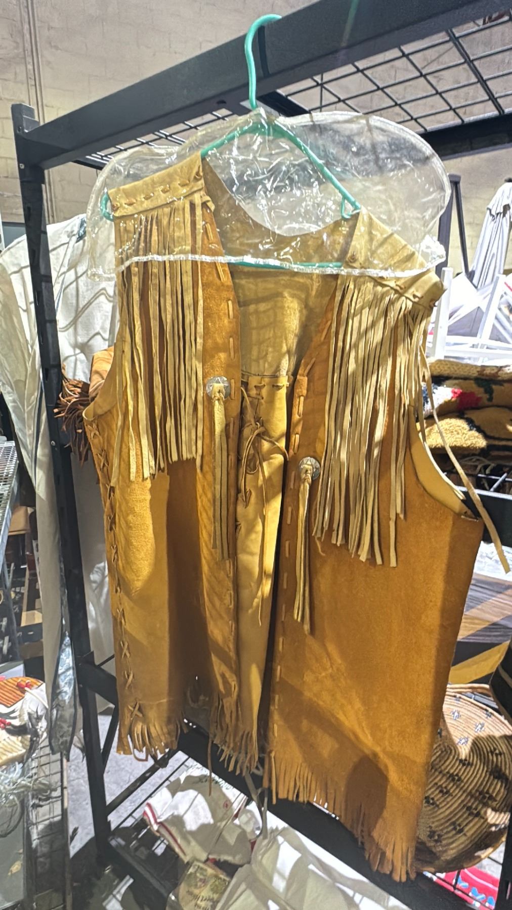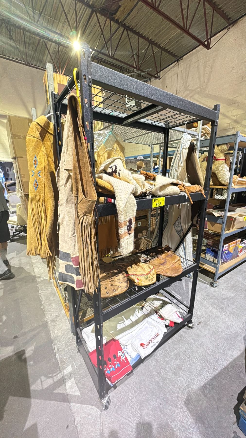 RACK OF ASSORTED ITEMS INCLUDING; FIRST NATIONS CLOTHING, SALISH HAND WOVEN TRAY, TEXTILES & MORE (RACK NOT INCLUDED)