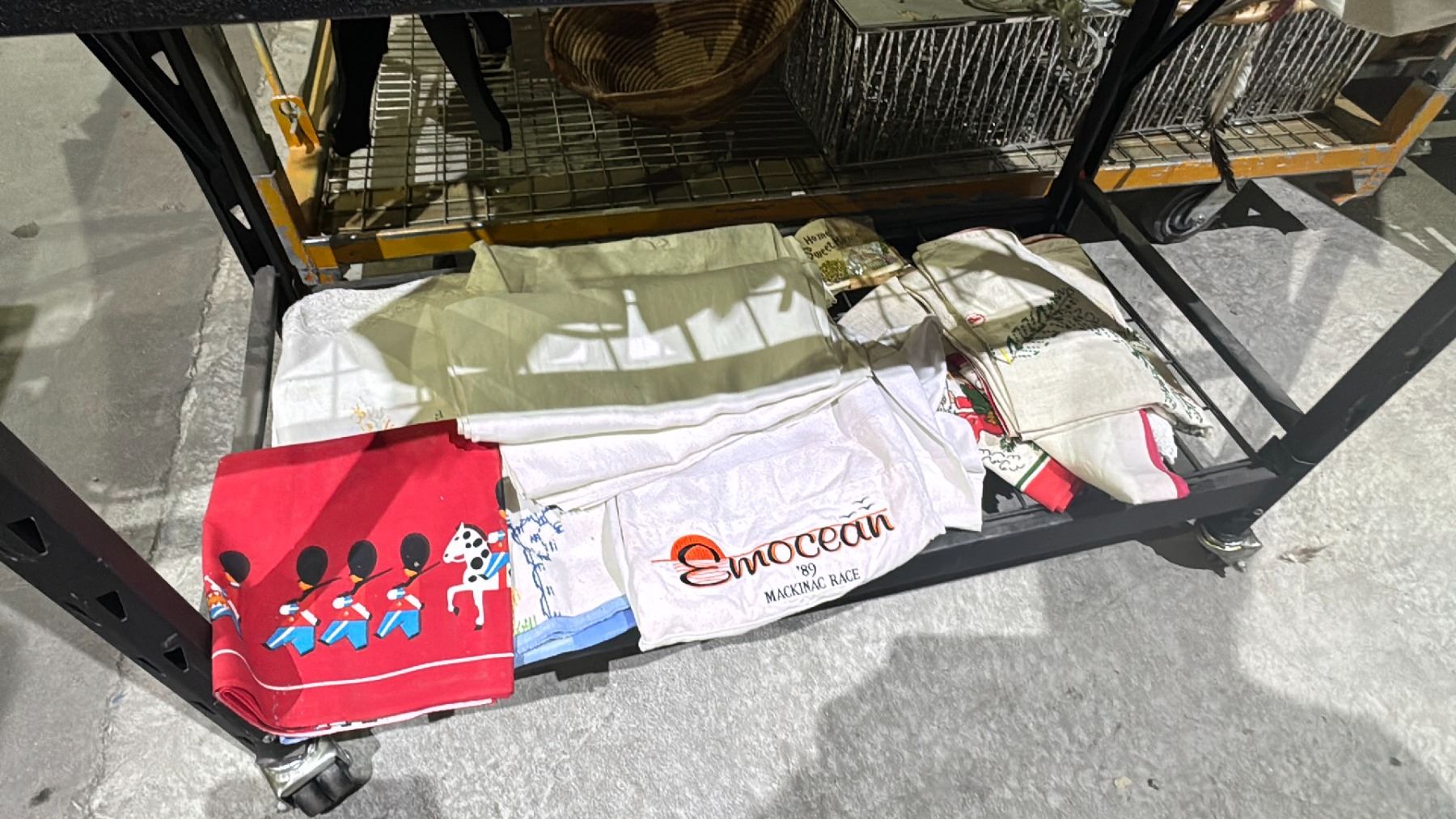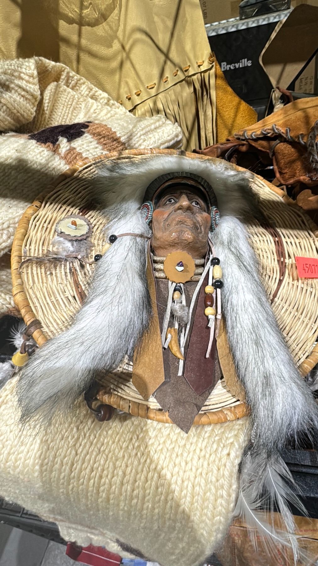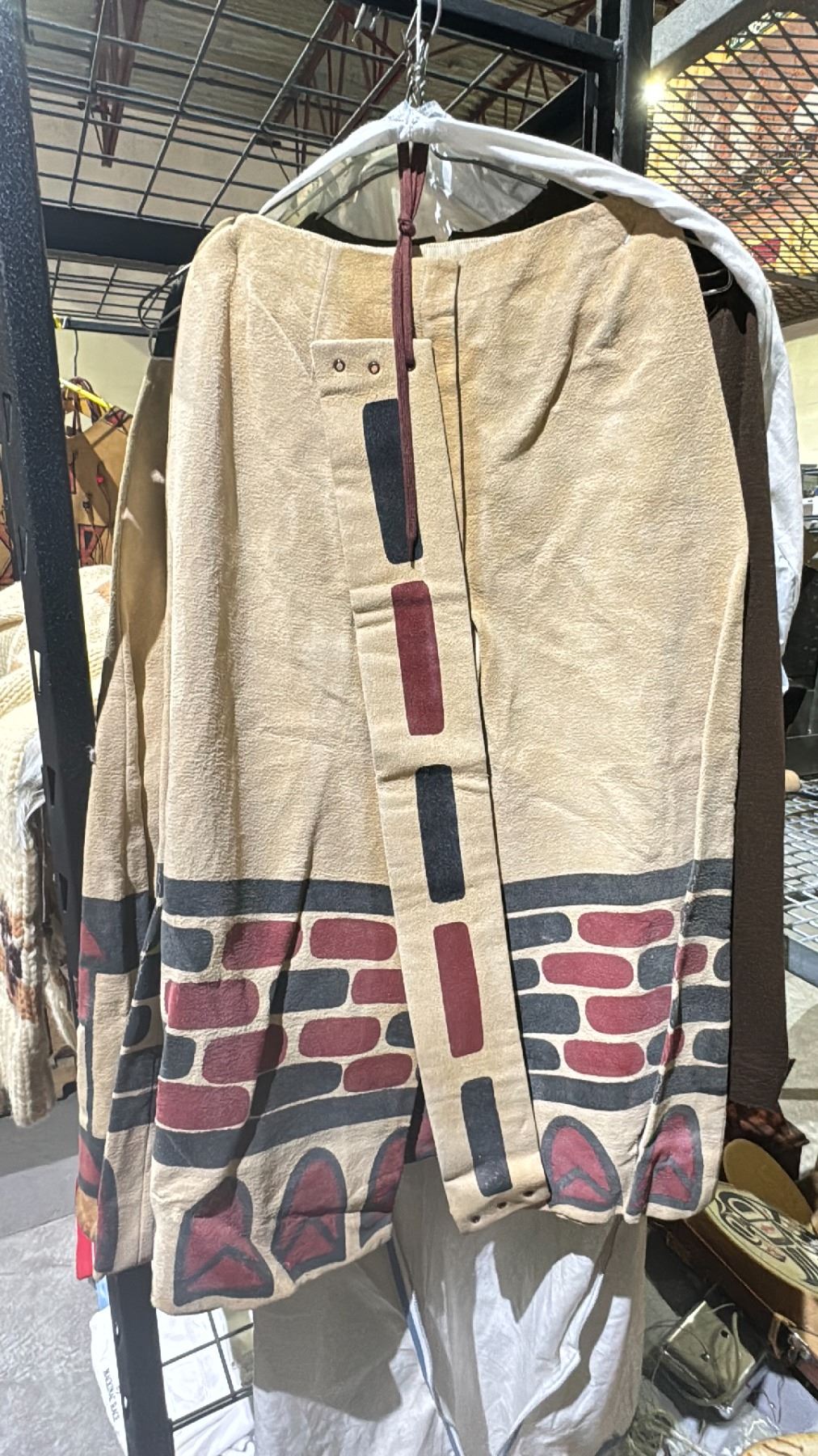 RACK OF ASSORTED ITEMS INCLUDING; FIRST NATIONS CLOTHING, SALISH HAND WOVEN TRAY, TEXTILES & MORE (RACK NOT INCLUDED)