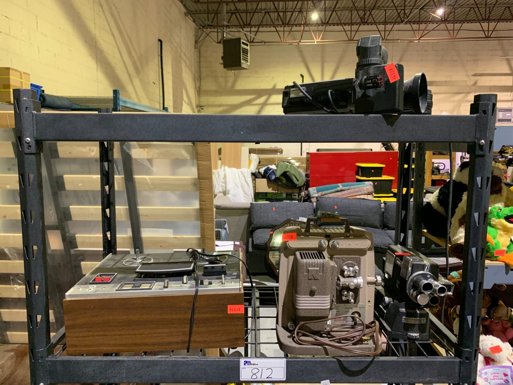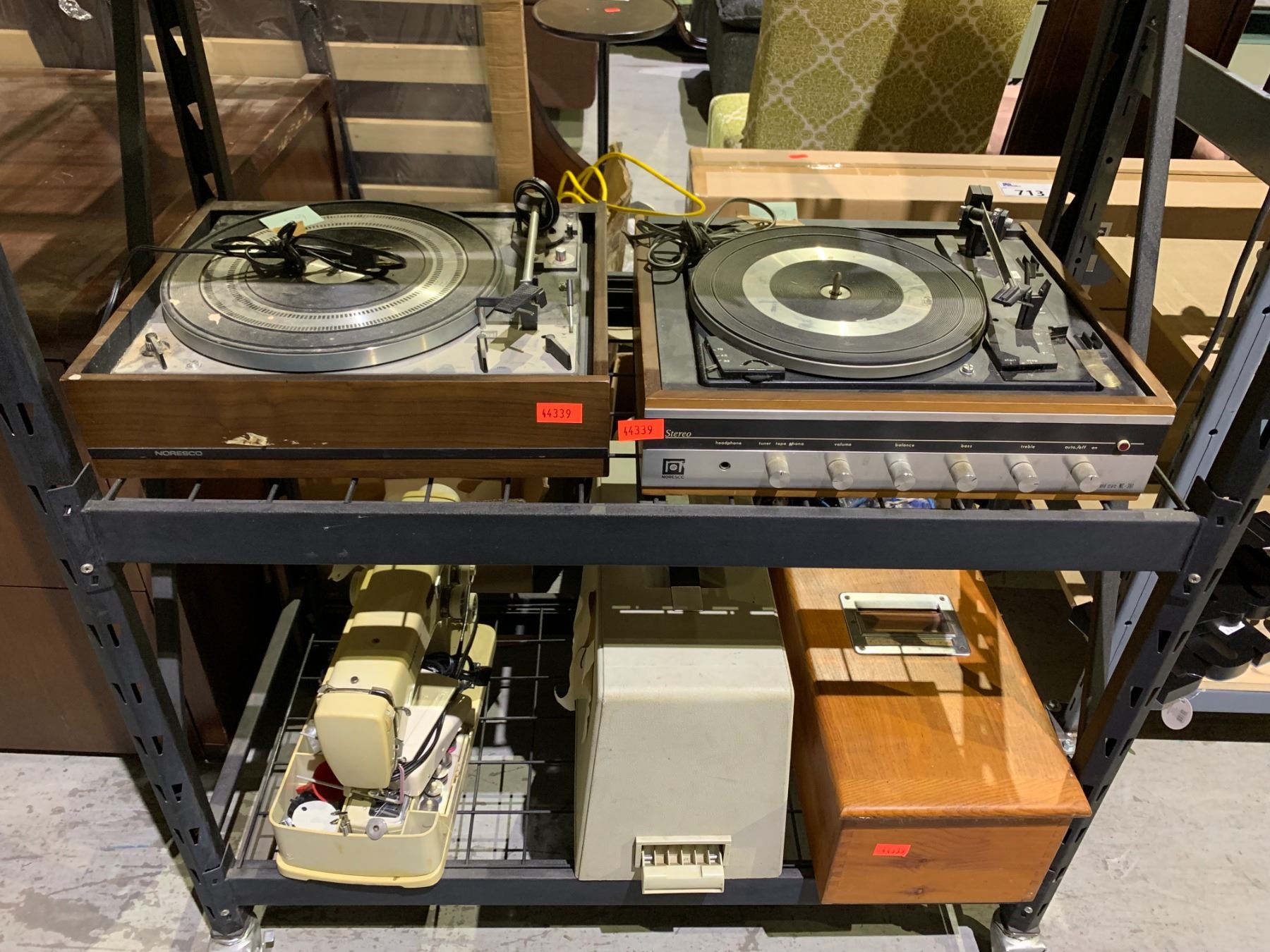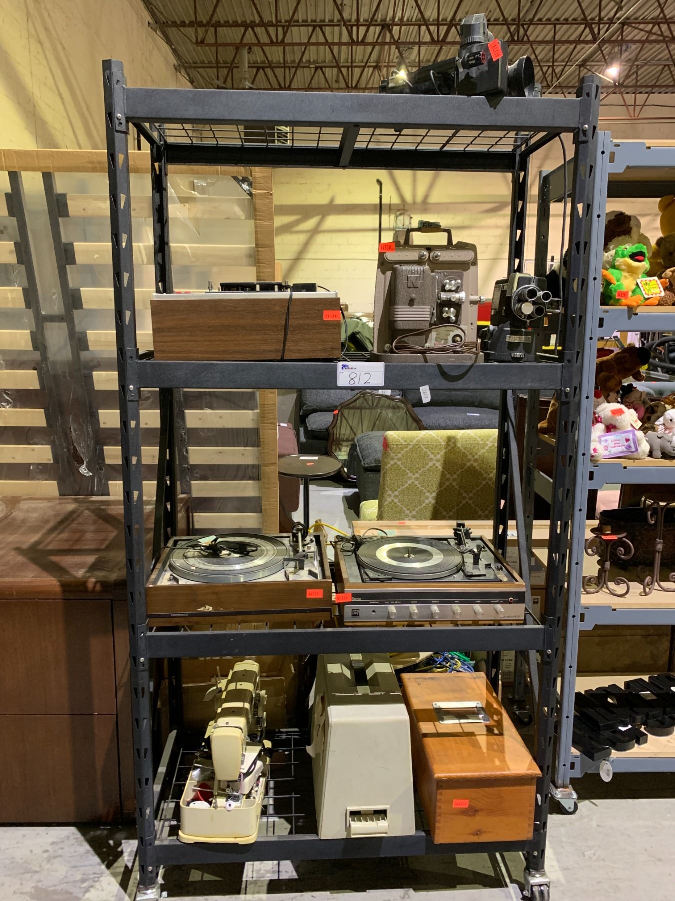 RACK OF ASSORTED VINTAGE ELECTRONICS INCLUDING; VIDEO CAMERA, TURN TABLES, SEWING MACHINE & MORE (RACK NOT INCLUDED)