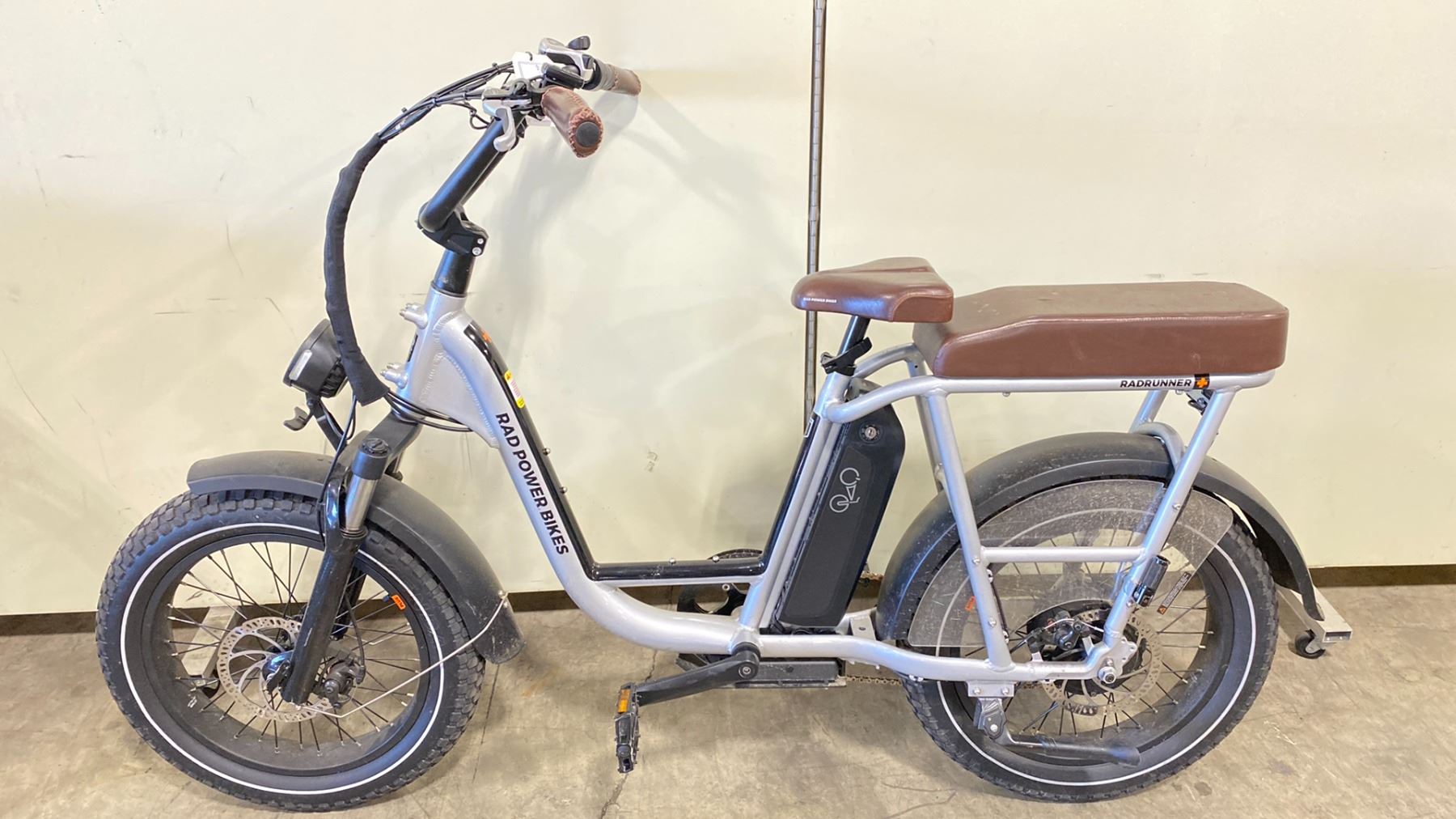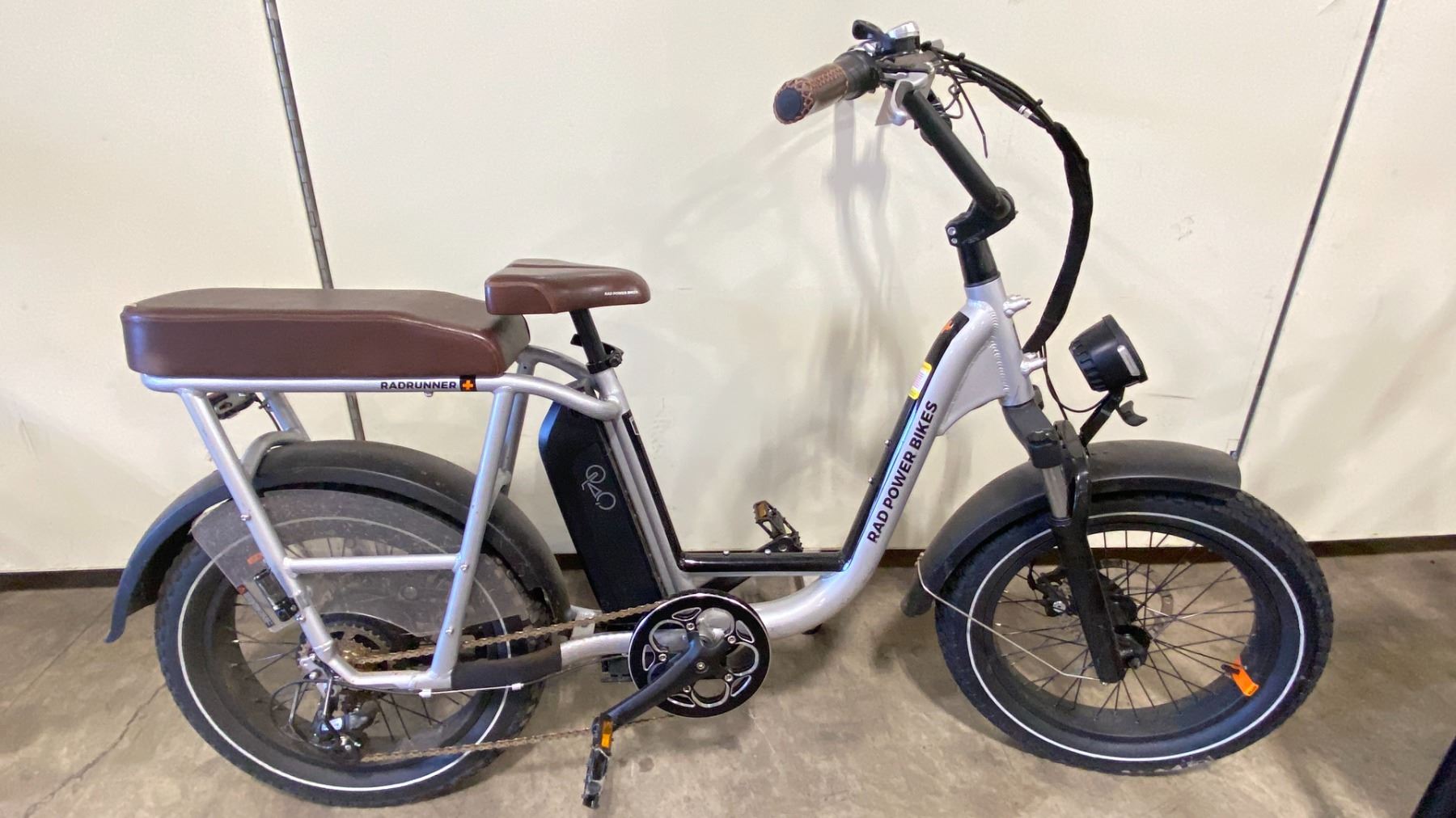 RAD POWER BIKES RAD RUNNER 7 SPEED SILVER ELECTRIC BIKE WITH PASSENGER SEAT ATTACHMENT * NO KEYS, NO CHARGER *