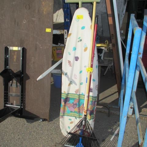 RAKES, SQUEEGEE, BROOM, IRONING BOARD, SM STEPS, PATIO UMBRELLA, ETC.