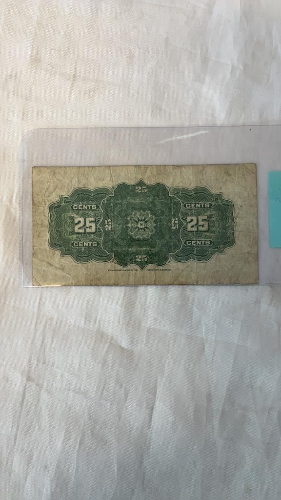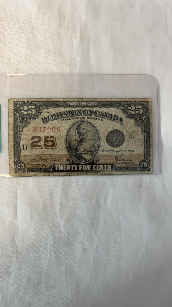 RARE 1923 CANADIAN 25 CENT BILL - "DOMINION OF CANADA"