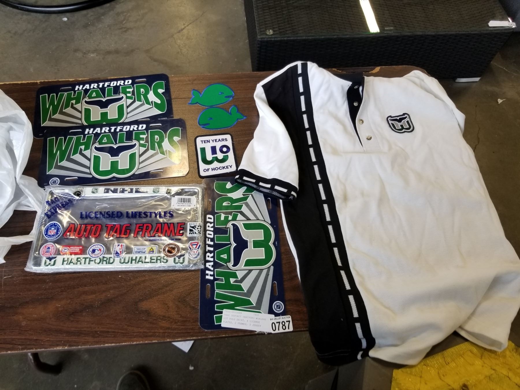 RARE DEFUNCT HARTFORD WHALERS LOT POLO SHIRT, 4 LICENSE PLATES, 2 FRAMES, 3 JERSEY PATCHES - RETAIL $230