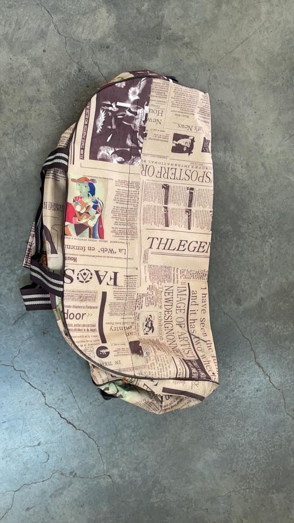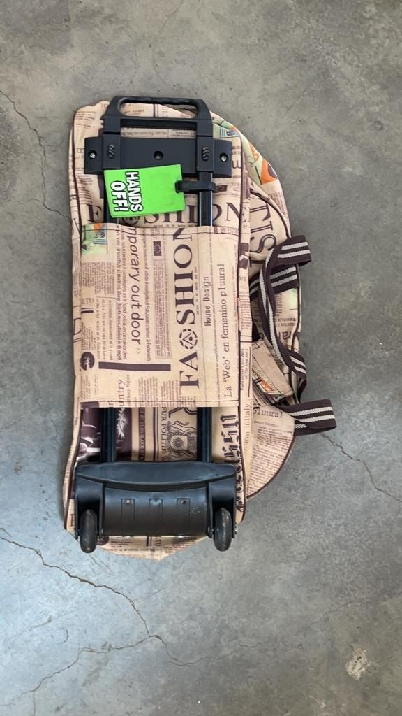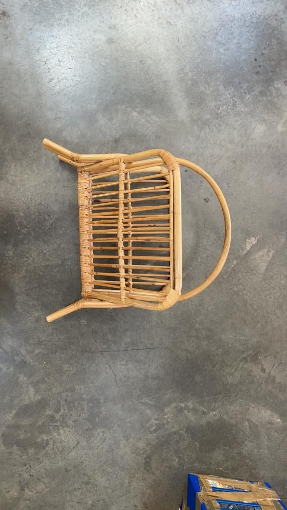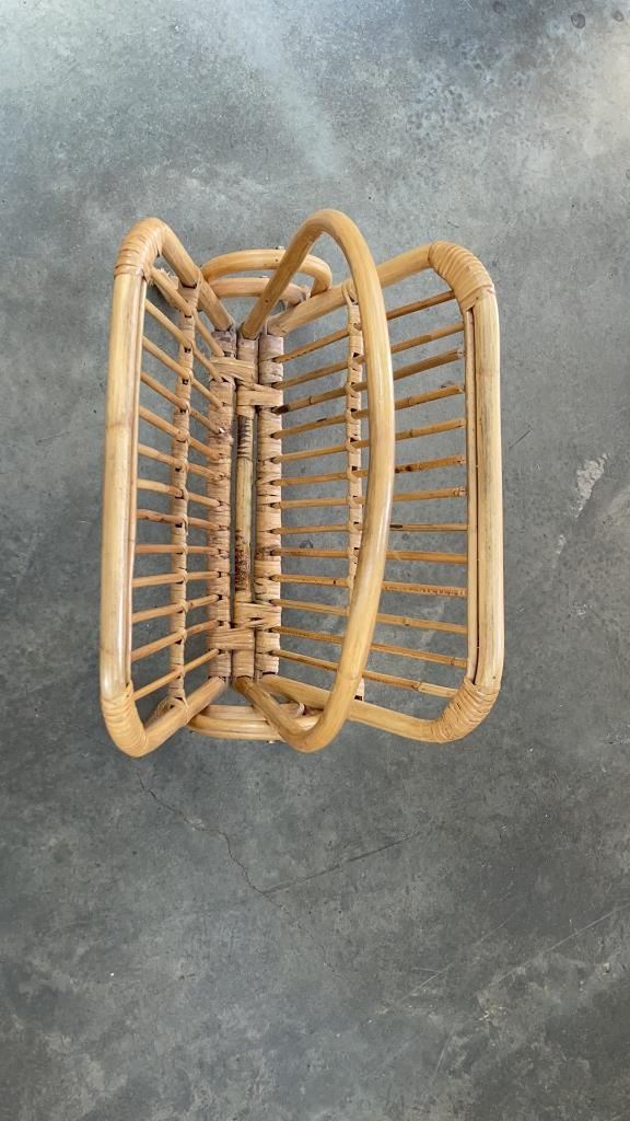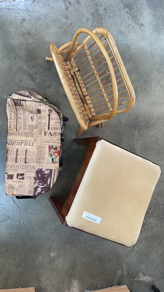 RATTAN MAGAZINE RACK, STOOL AND PERSONAL SHOPPING CART WITH BAG