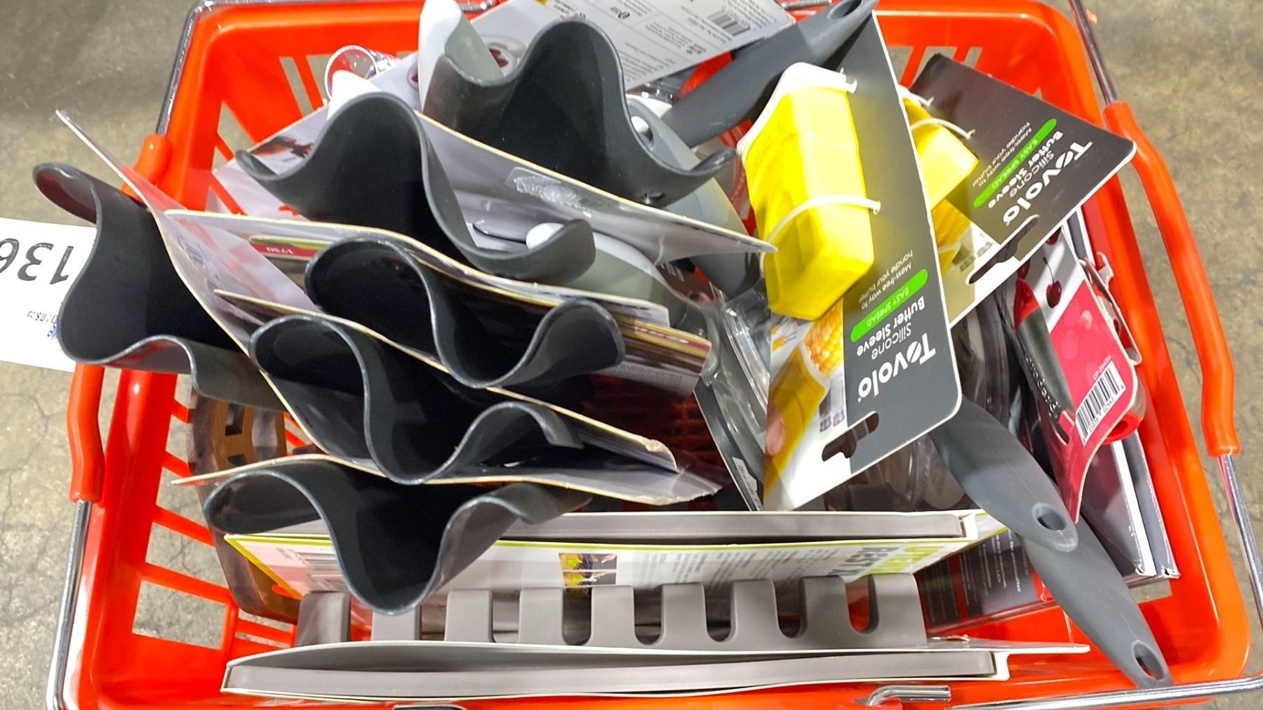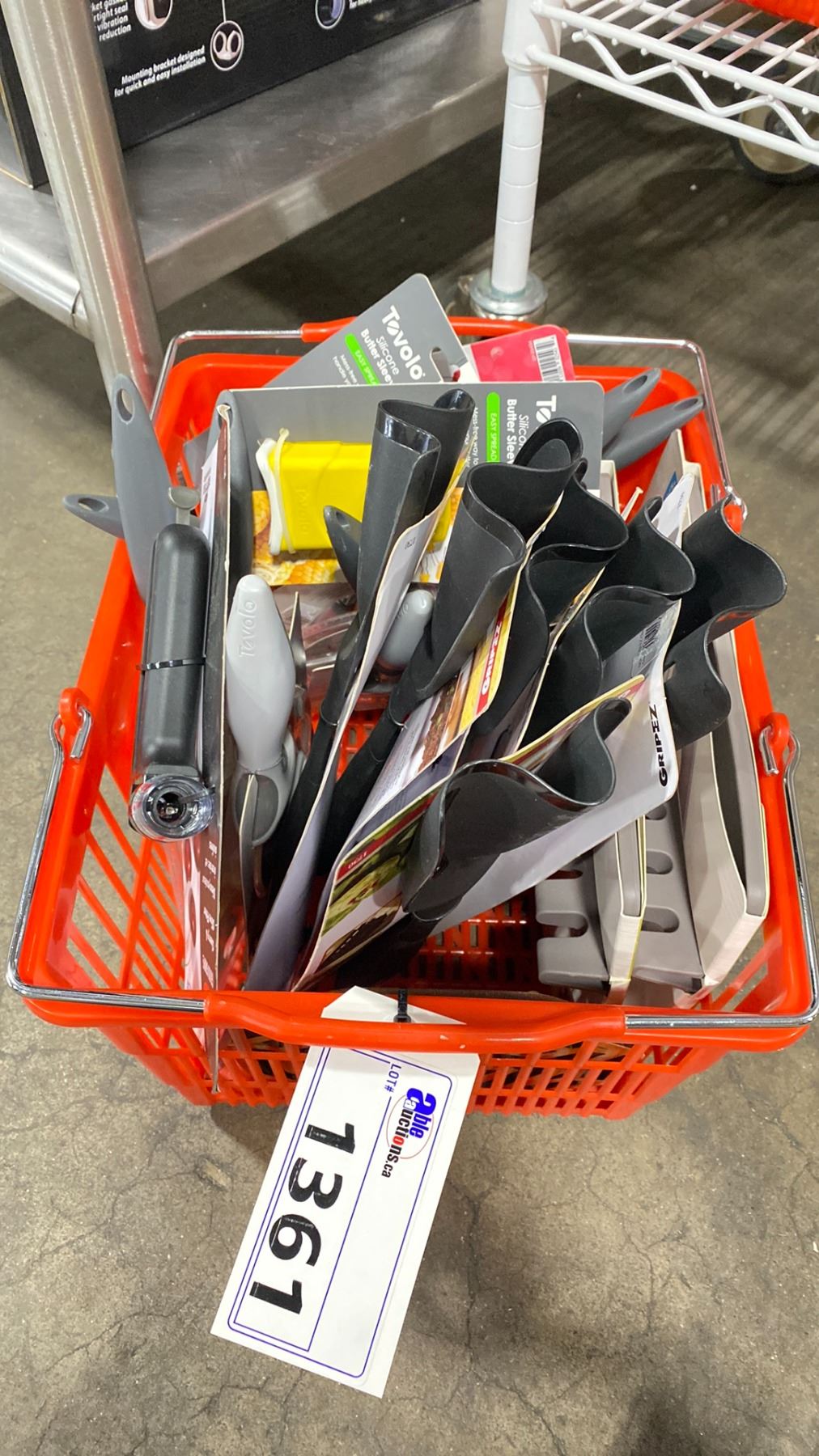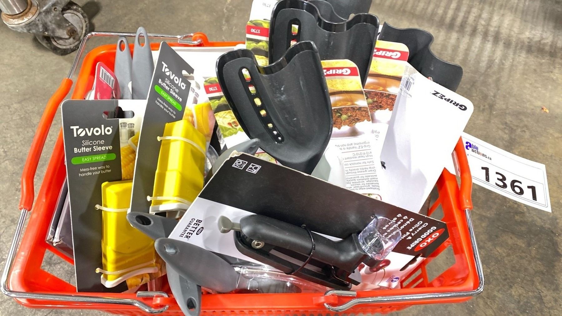 RED BASKET OF ASSORTED NEW RETAIL KITCHEN ITEMS/UTENSILS *BASKET INCLUDED*