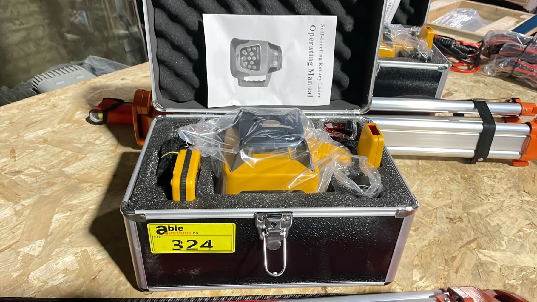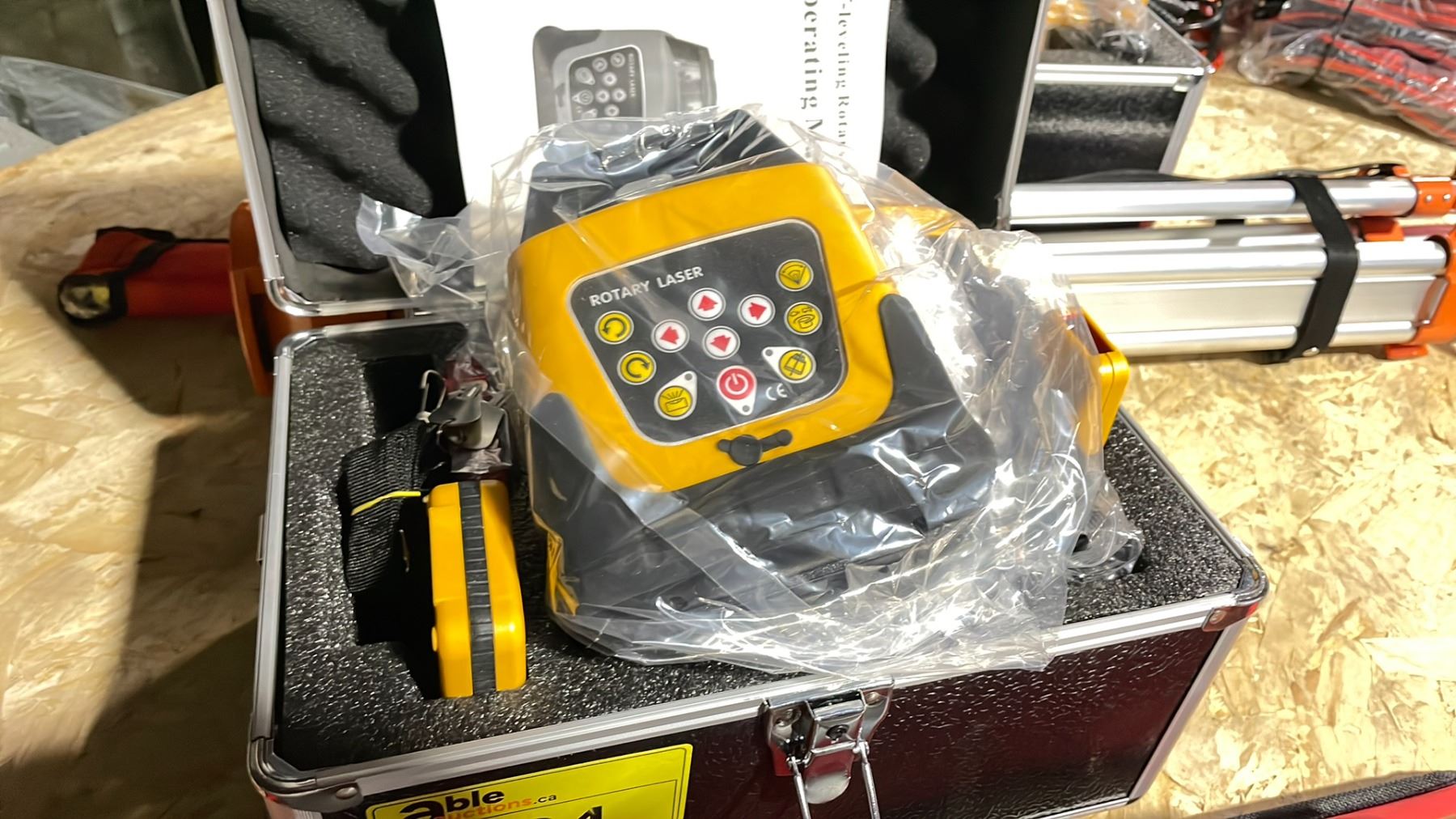 RED BEAM SELF LEVELING INDUSTRIAL ROTARY LASER IN HARD TRANSPORT CASE WITH MEASURE STICK IN BAG & TRIPOD